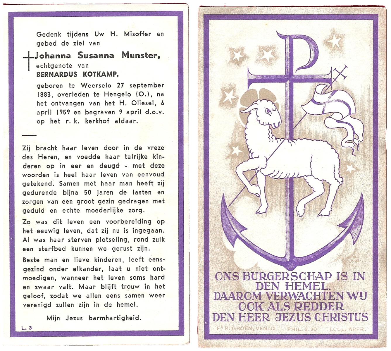 MUNSTER, Johanna Suzanna, geboren op 27-09-1883 te Weerselo, overleden op 6-4-1959 te Hengelo (Ov.) op 75-jarige leeftijd, begraven op 9-4-1959 te Hengelo (Ov.).
