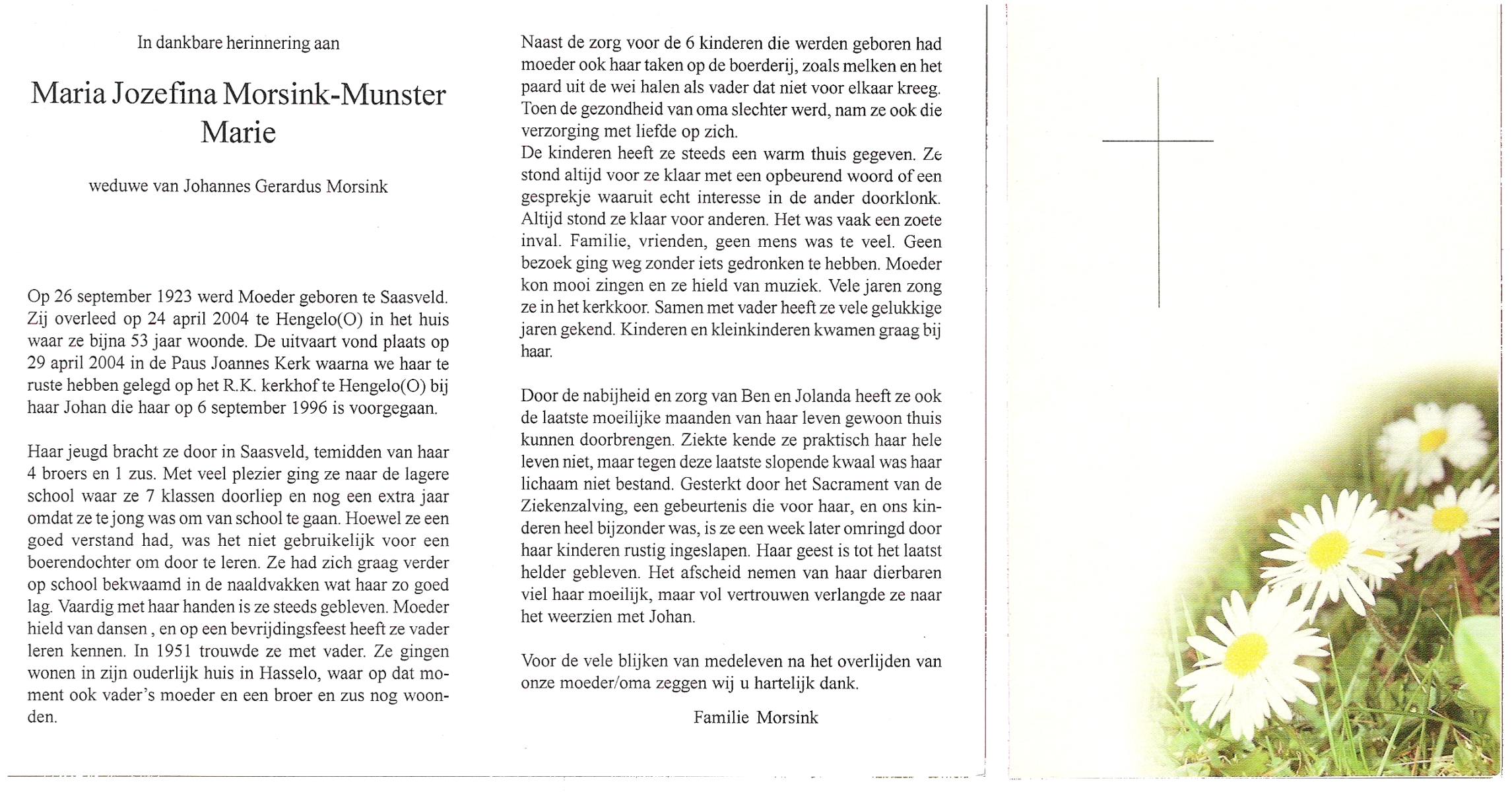 MUNSTER, Maria Jozefina (Marie), geboren op 26-9-1923 te Saasveld, overleden op 24-4-2004 te Hengelo (Ov.) op 80-jarige leeftijd, begraven op 29-4-2004 te Hengelo (Ov.).