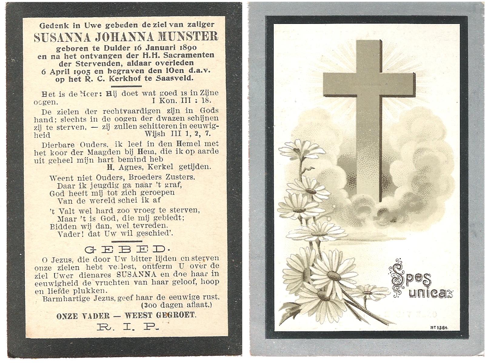 MUNSTER, Susanna Johanna, geboren op 16-01-1890 te Dulder, overleden op 6-4-1905 te Dulder op 15-jarige leeftijd, begraven op 10-4-1905 te Saasveld.