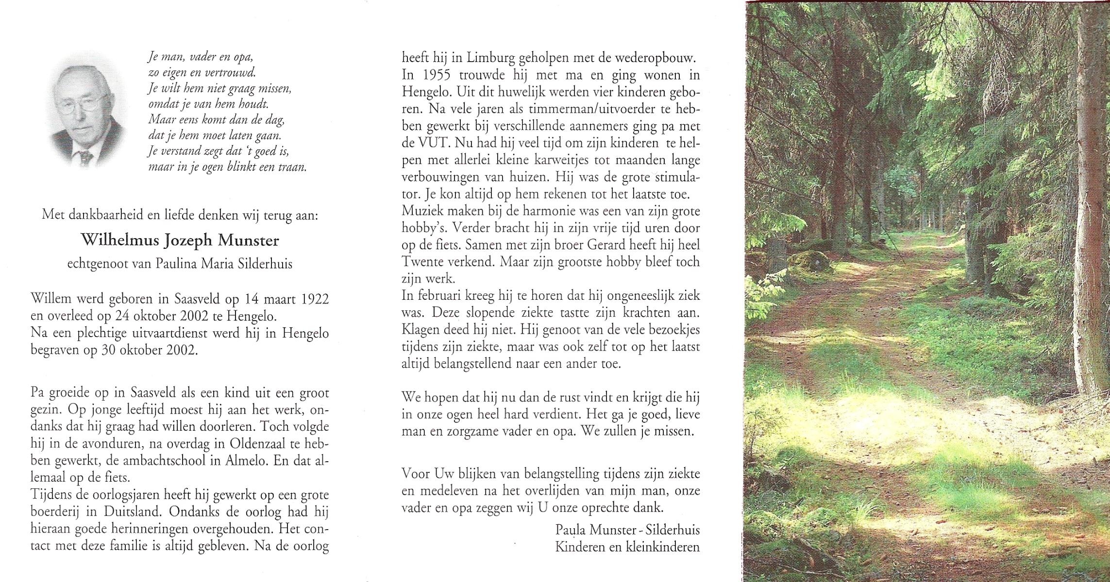 MUNSTER, Wilhelmus Jozeph, geboren op 14-3-1922 te Saasveld, overleden op 24-10-2002 te Hengelo (Ov.) op 80-jarige leeftijd, begraven op 30-10-2002 te Hengelo (Ov.).