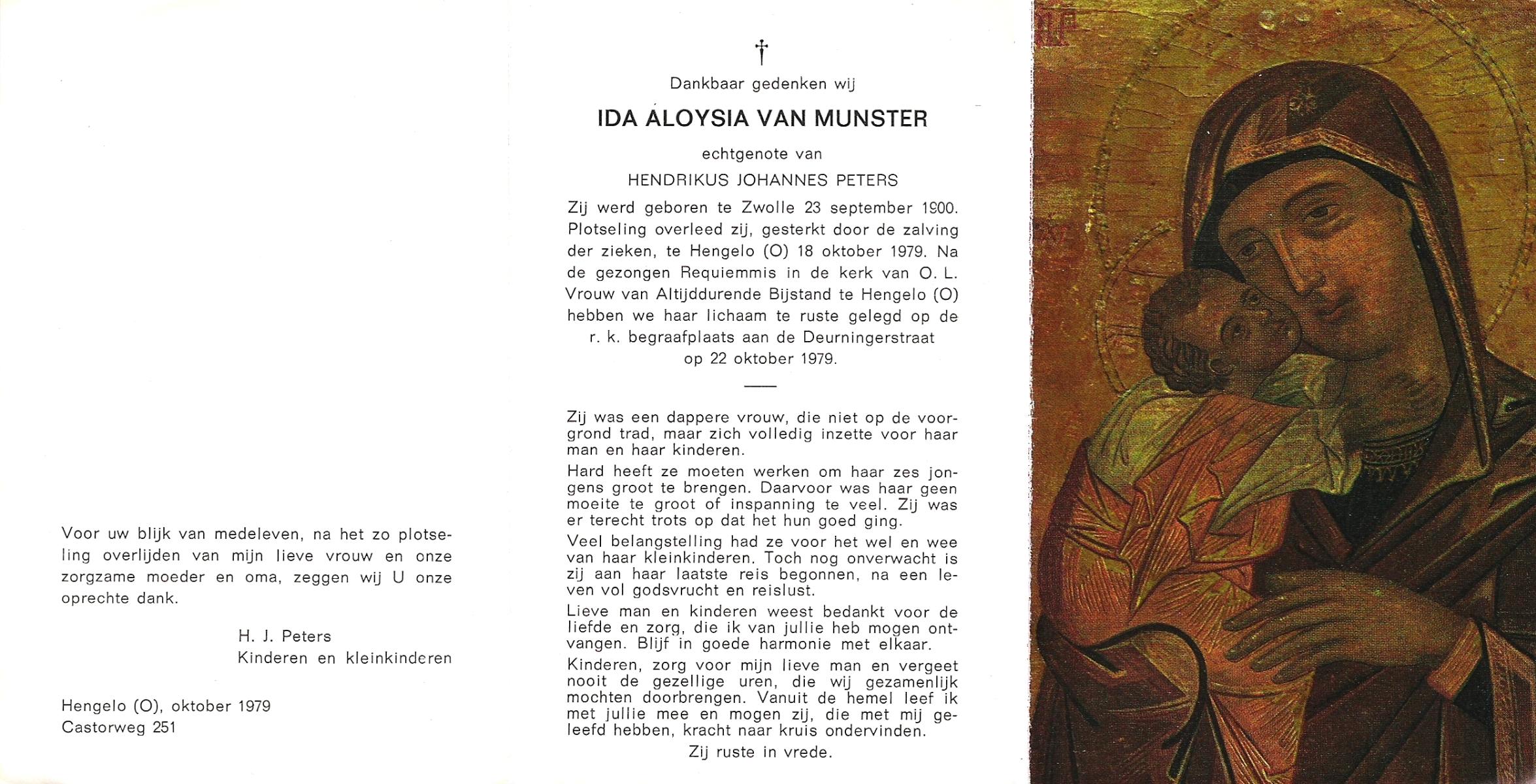 MUNSTER, van, Ida Aloysia, geboren op 23-9-1900 te Zwolle, overleden op 18-10-1979 te Hengelo (Ov.) op 79-jarige leeftijd, begraven op 22-10-1979 te Hengelo (Ov.).