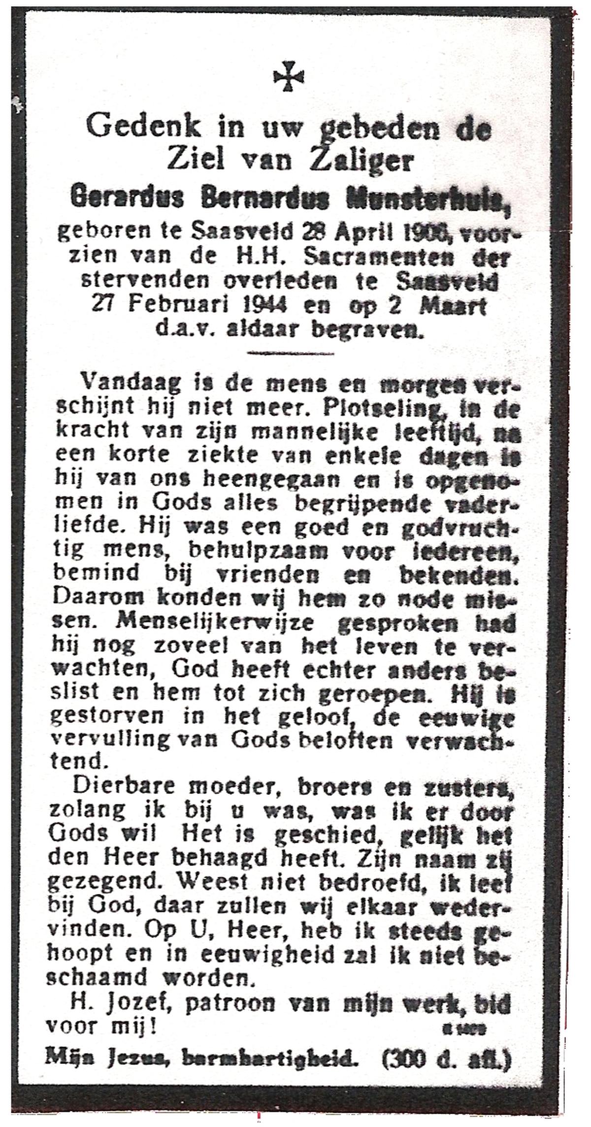 MUNSTERHUIS, Gerardus Bernardus, geboren op 28-4-1906 te Saasveld, overleden op 27-2-1944 te Saasveld op 37-jarige leeftijd, begraven op 2-3-1944 te Saasveld.