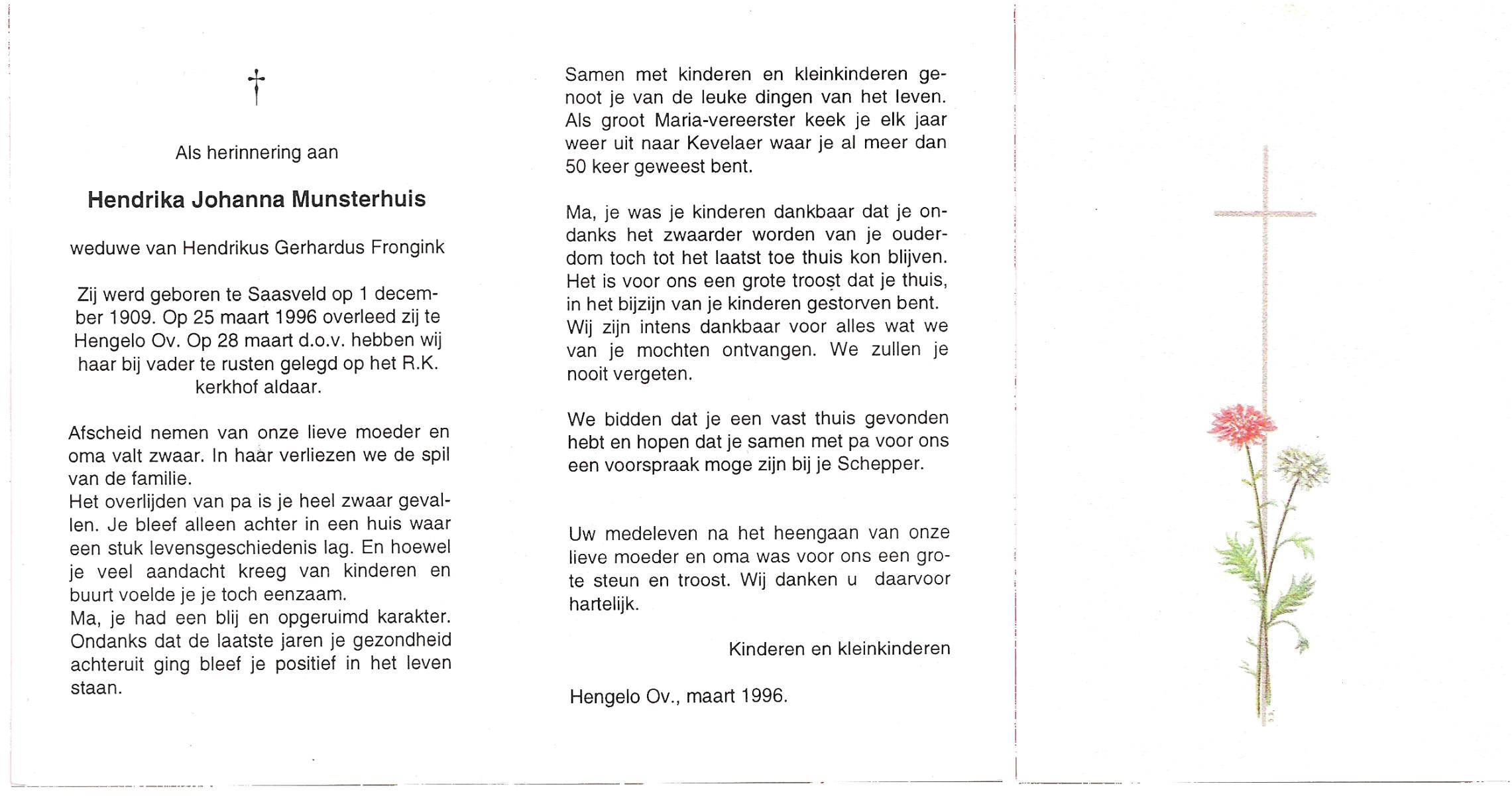 MUNSTERHUIS, Hendrika Johanna, geboren op 1-12-1909 te Saasveld, overleden op 25-3-1996 te Hengelo (Ov.) op 88-jarige leeftijd, begraven op 28-3-1996 te Hengelo (Ov.).