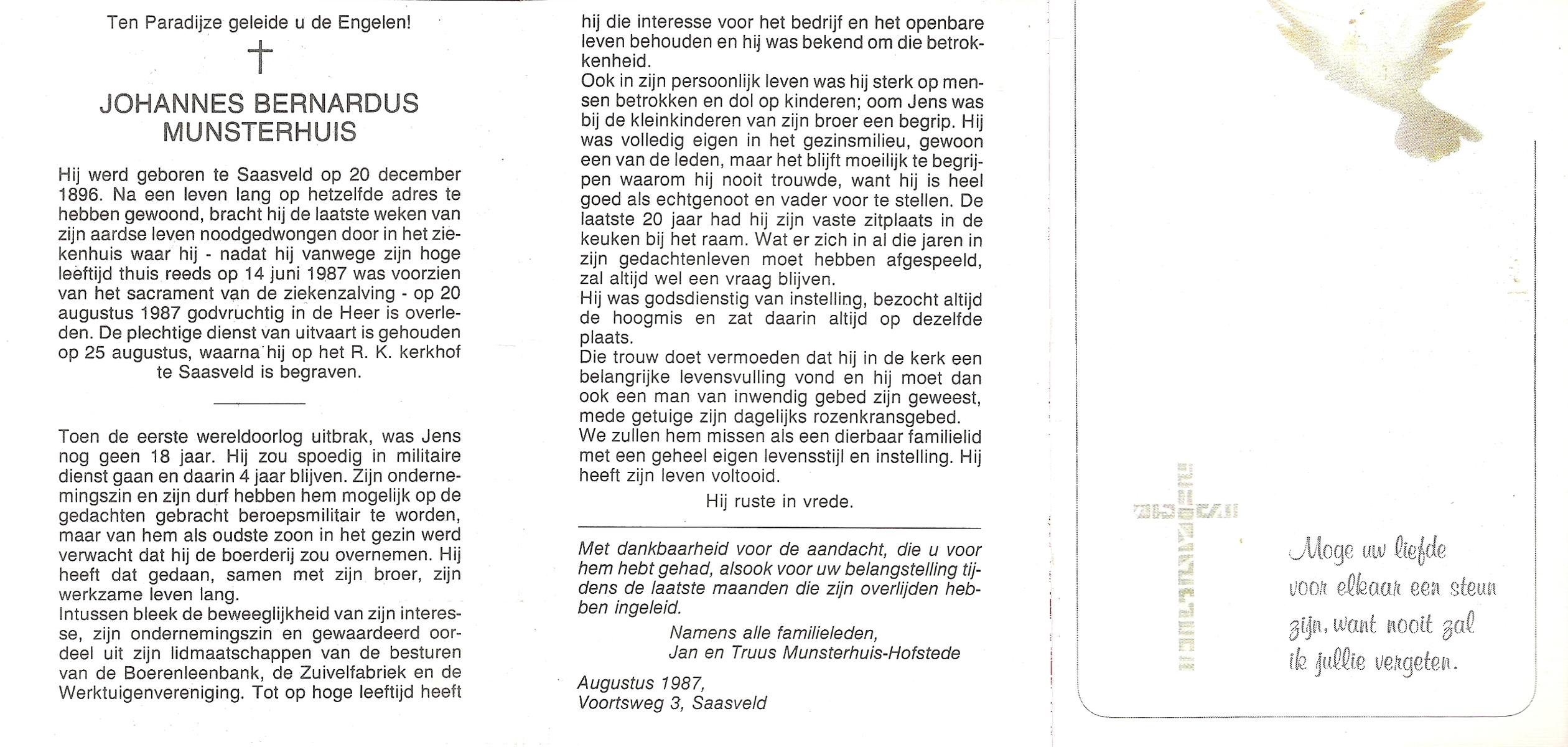 MUNSTERHUIS, Johannes Bernardus, geboren op 20-12-1896 te Saasveld, overleden op 20-8-1987 op 90-jarige leeftijd, begraven op 25-8-1987 te Saasveld.