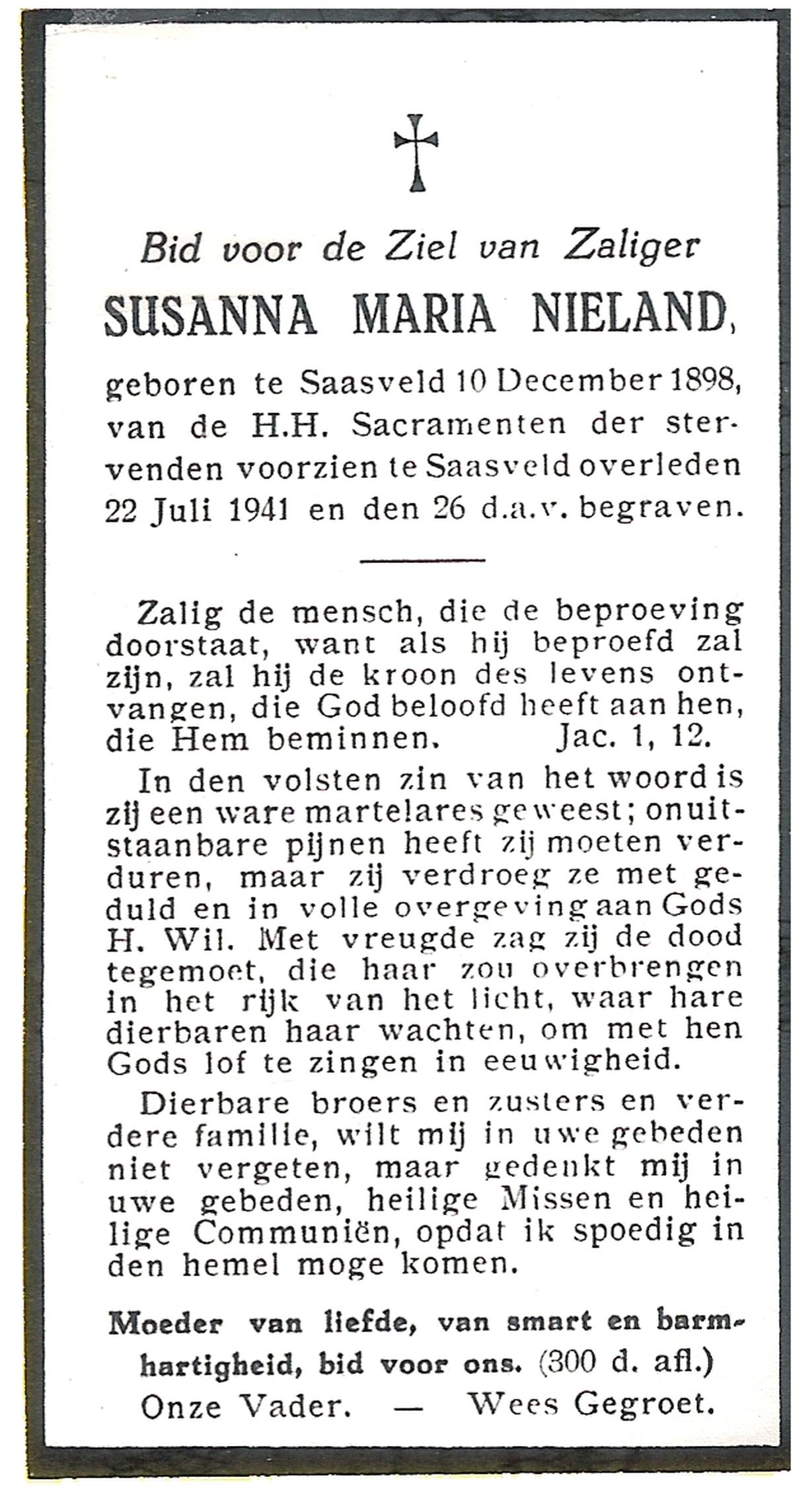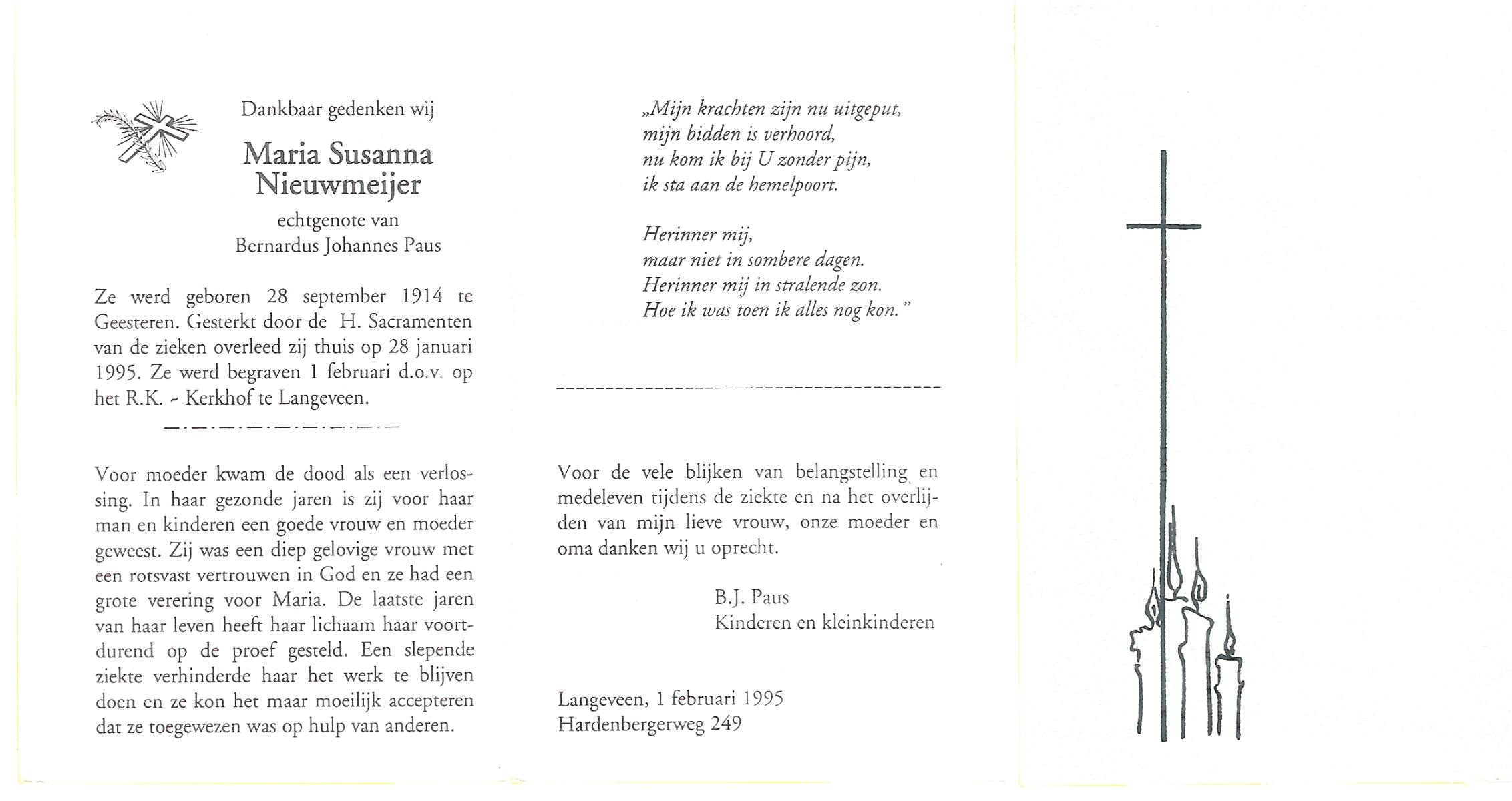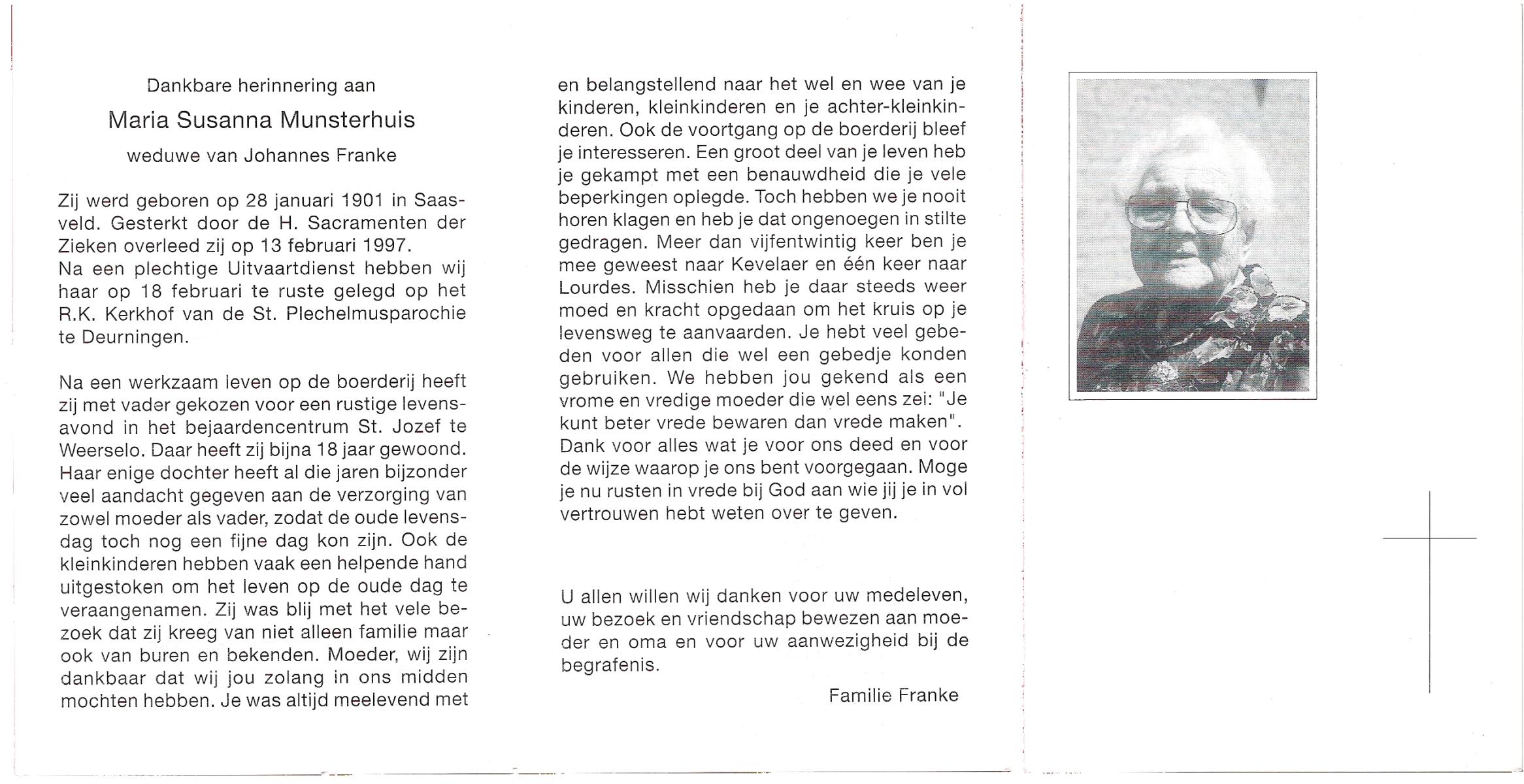 MUNSTERHUIS, Maria Susanna, geboren op 28-1-1901 te Saasveld, overleden op 13-2-1997 op 96-jarige leeftijd, begraven op 18-2-1997 te Deurningen.