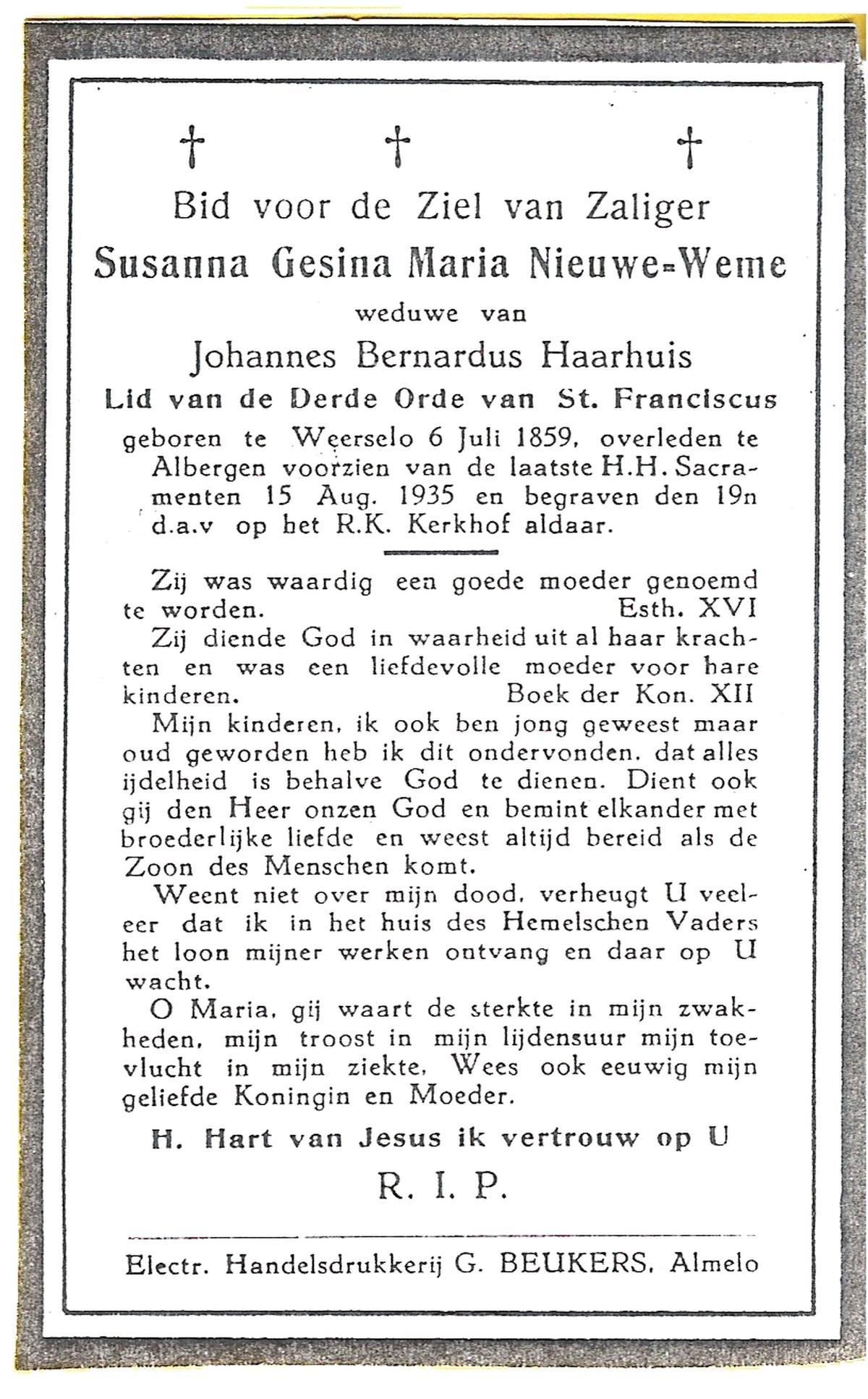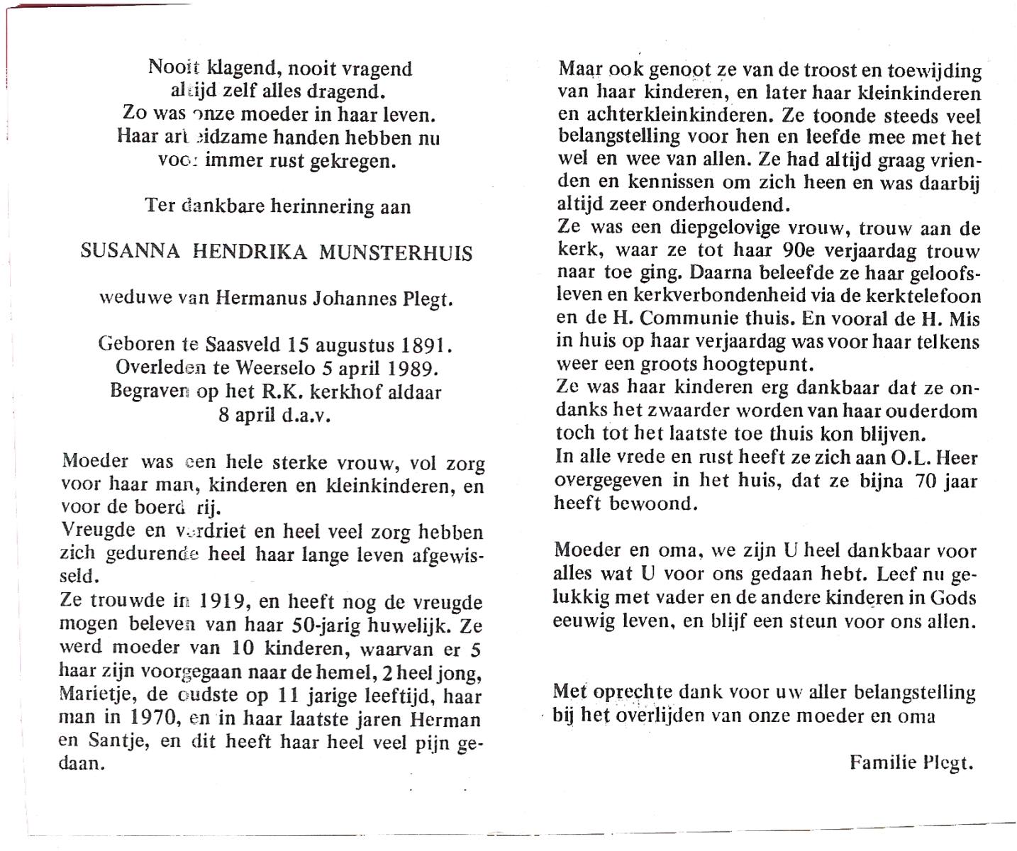 MUNSTERHUIS, Susanna Hendrika, geboren op 15-08-1891 te Saasveld, overleden op 5-4-1989 te Weerselo op 97-jarige leeftijd, begraven op 8-4-1989 te Weerselo.