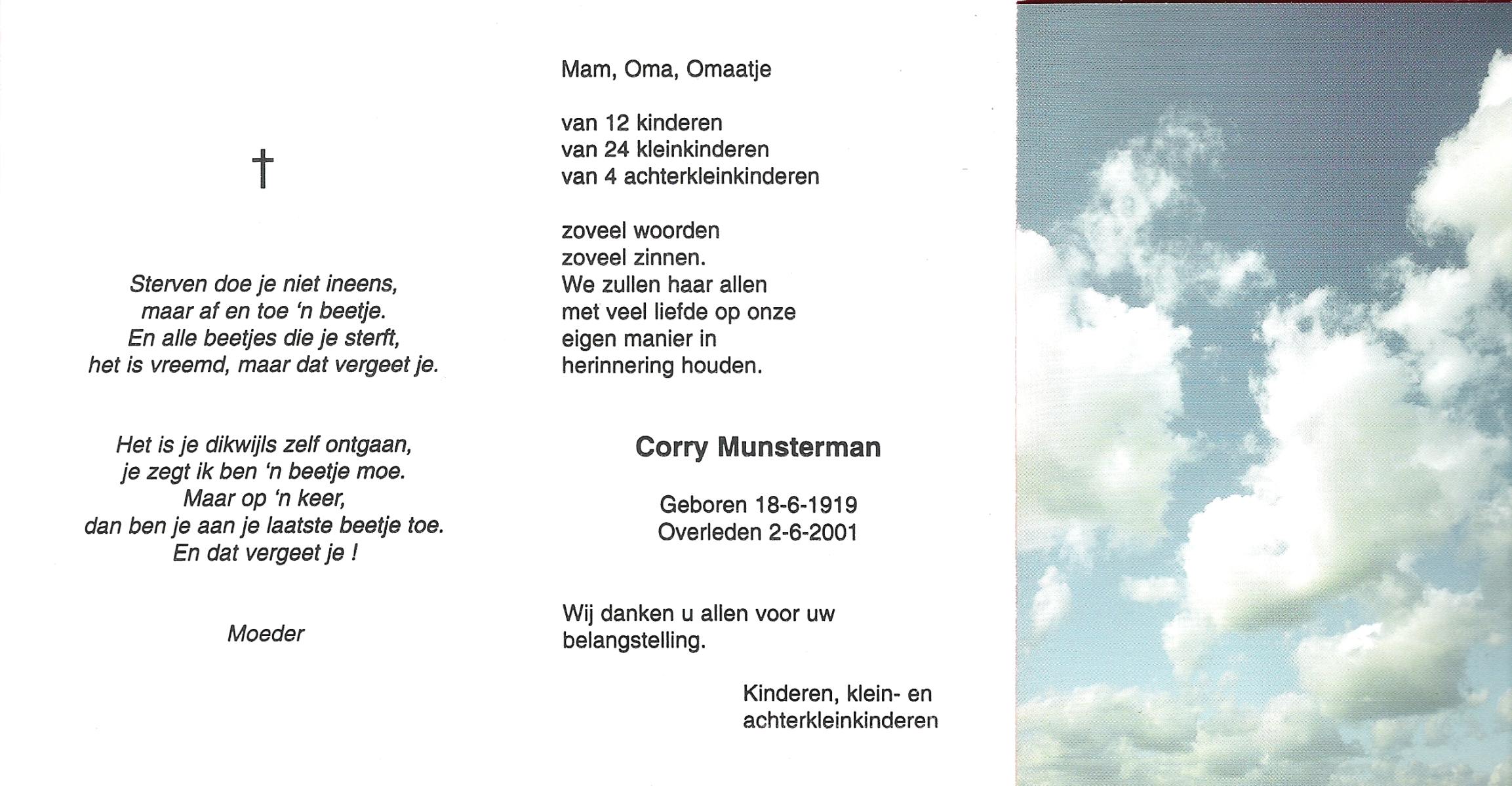 MUNSTERMAN, Corry, geboren op 18-6-1919, overleden op 2-6-2001 op 81-jarige leeftijd.