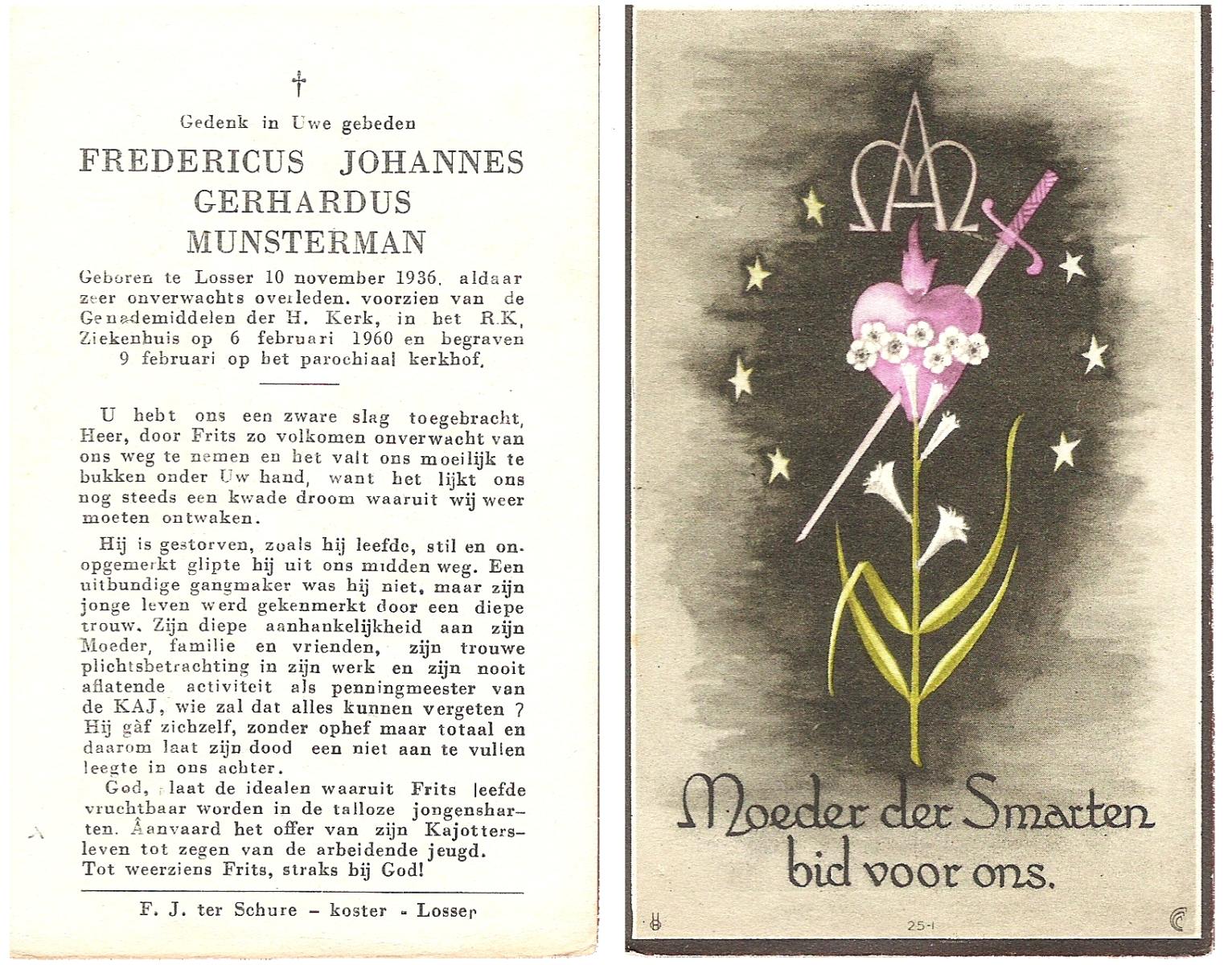 MUNSTERMAN, Fredericus Johanes Gerhardus, geboren op 10-11-1936 te Losser, overleden op 6-2-1960 te Losser op 23-jarige leeftijd, begraven op 9-2-1960 te Losser.