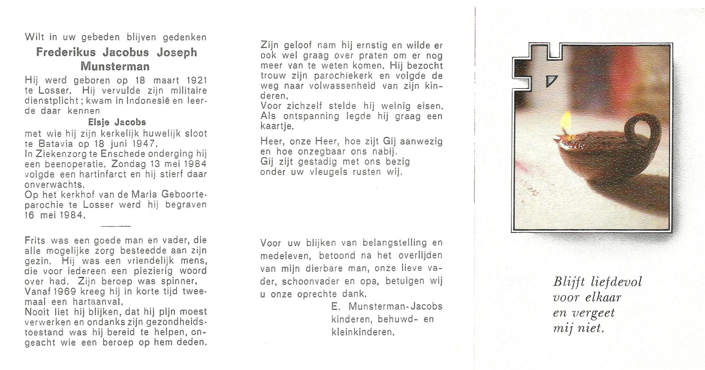 MUNSTERMAN, Frederikus Jacobus Joseph, geboren op 18-3-1921 te Losser, overleden op 13-5-1984 te Enschede op 63-jarige leeftijd, begraven op 16-5-1984 te Losser.