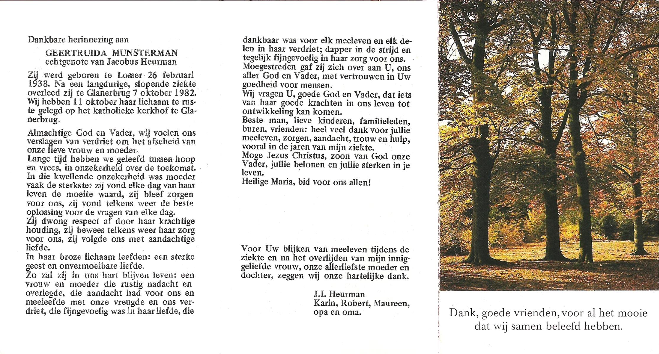 MUNSTERMAN, Geertruida, geboren op 26-2-1938 te Losser, overleden op 7-10-1982 te Glanerbrug op 44-jarige leeftijd, begraven op 11-10-1982 te Glanerbrug.
