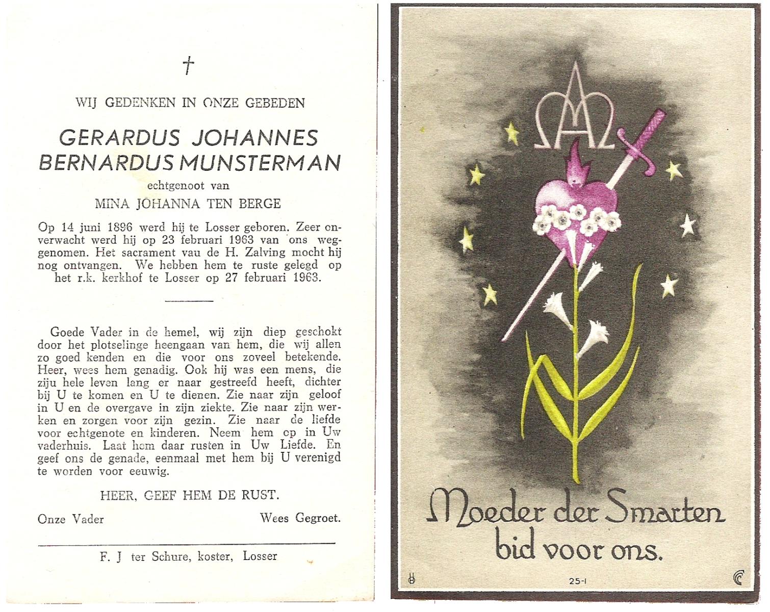 MUNSTERMAN, Gerardus Johannes Bernardus, geboren op 14-06-1896 te Losser, overleden op 23-2-1963 te Losser op 66-jarige leeftijd, begraven op 27-2-1963 te Losser.