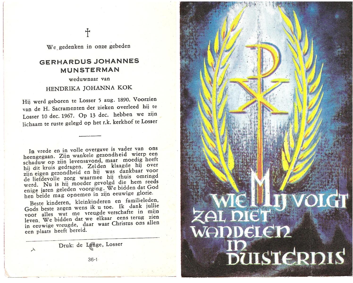 MUNSTERMAN, Gerhardus Johannes, geboren op 05-08-1890 te Losser, overleden op 10-12-1967 te Losser op 77-jarige leeftijd, begraven op 13-12-1967 te Losser.