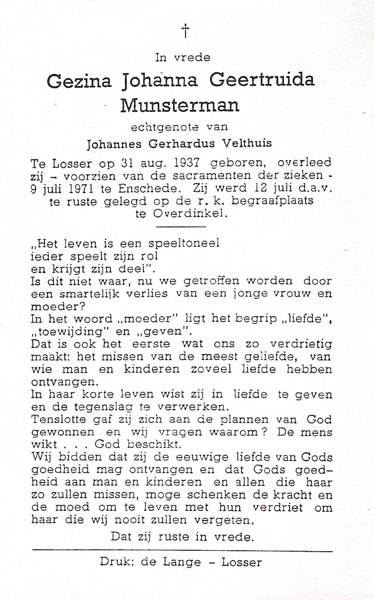 MUNSTERMAN, Gezina Johanna Geertruida, geboren op 31-8-1937 te Losser, overleden op 9-7-1971 te Enschede op 33-jarige leeftijd, begraven op 12-7-1971 te Overdinkel.