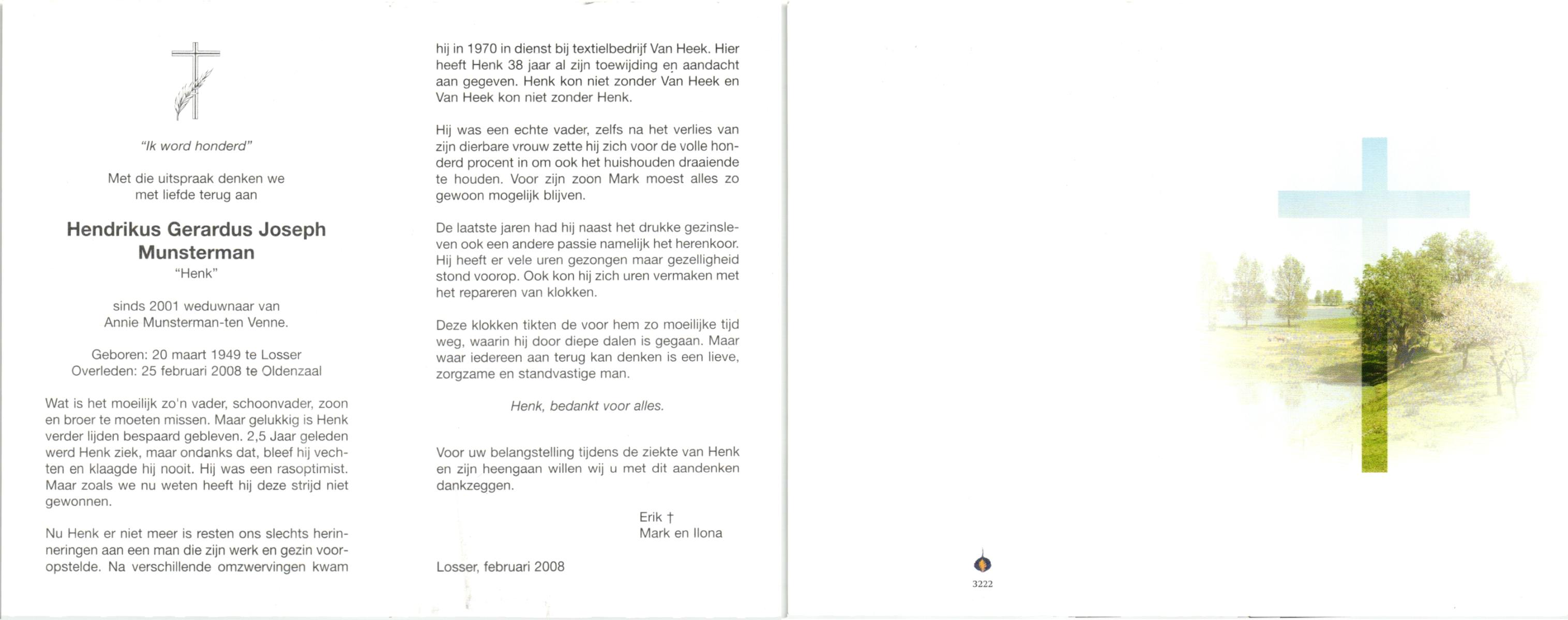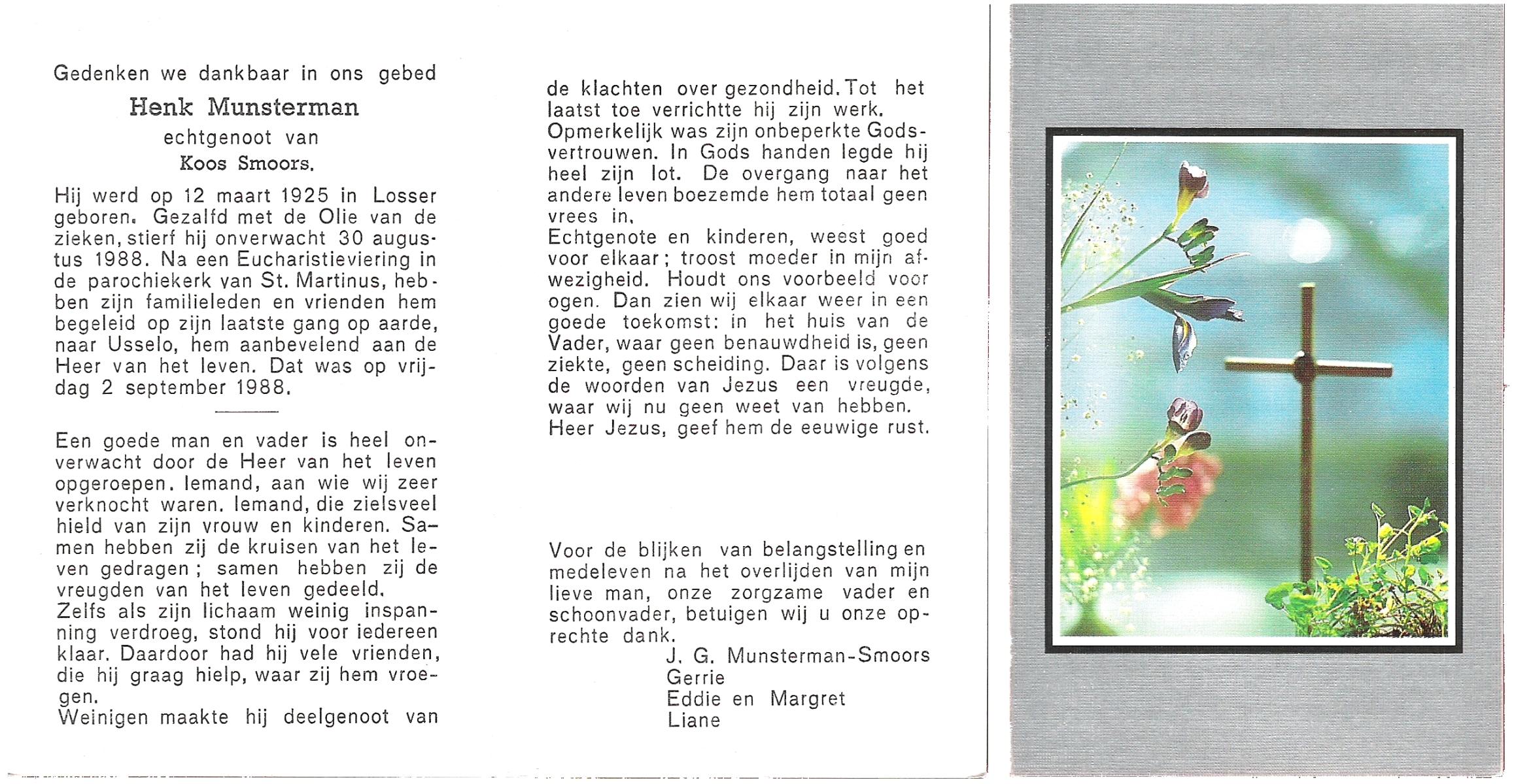MUNSTERMAN, Henk, geboren op 12-3-1925 te Losser, overleden op 30-8-1988 op 63-jarige leeftijd, gecremeerd op 2-9-1988 te Usselo.