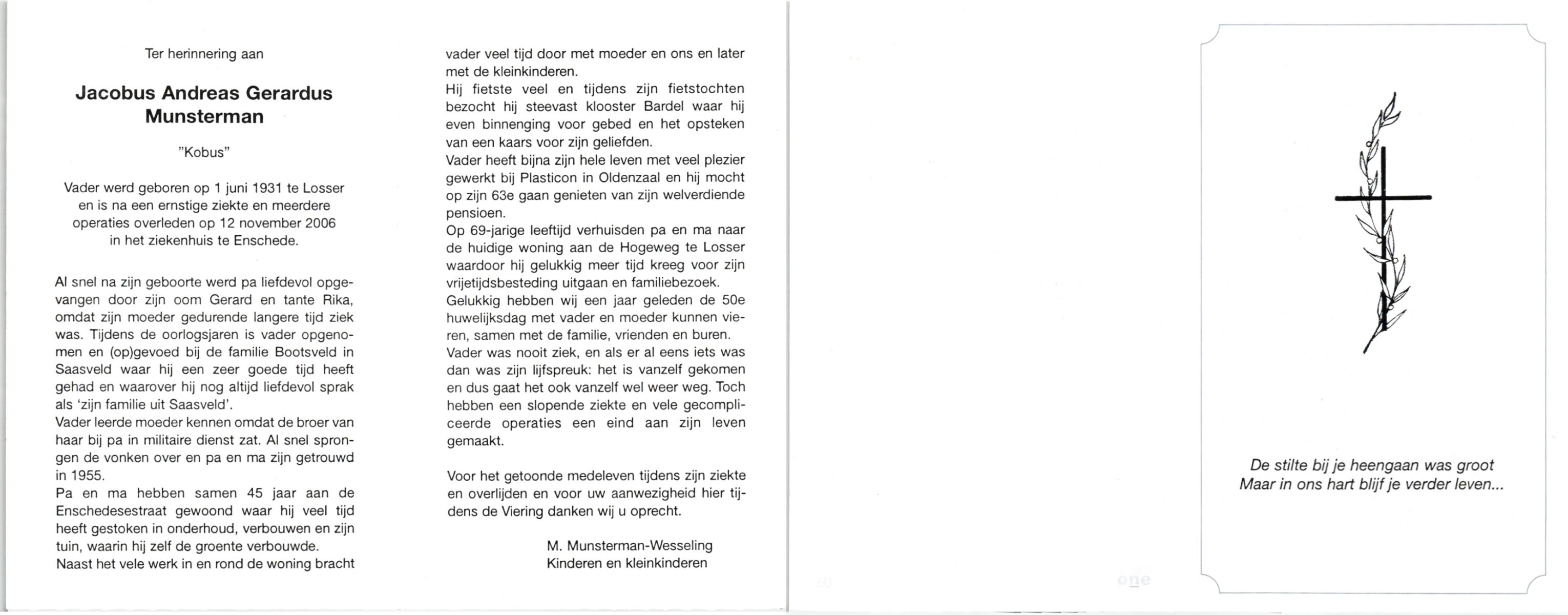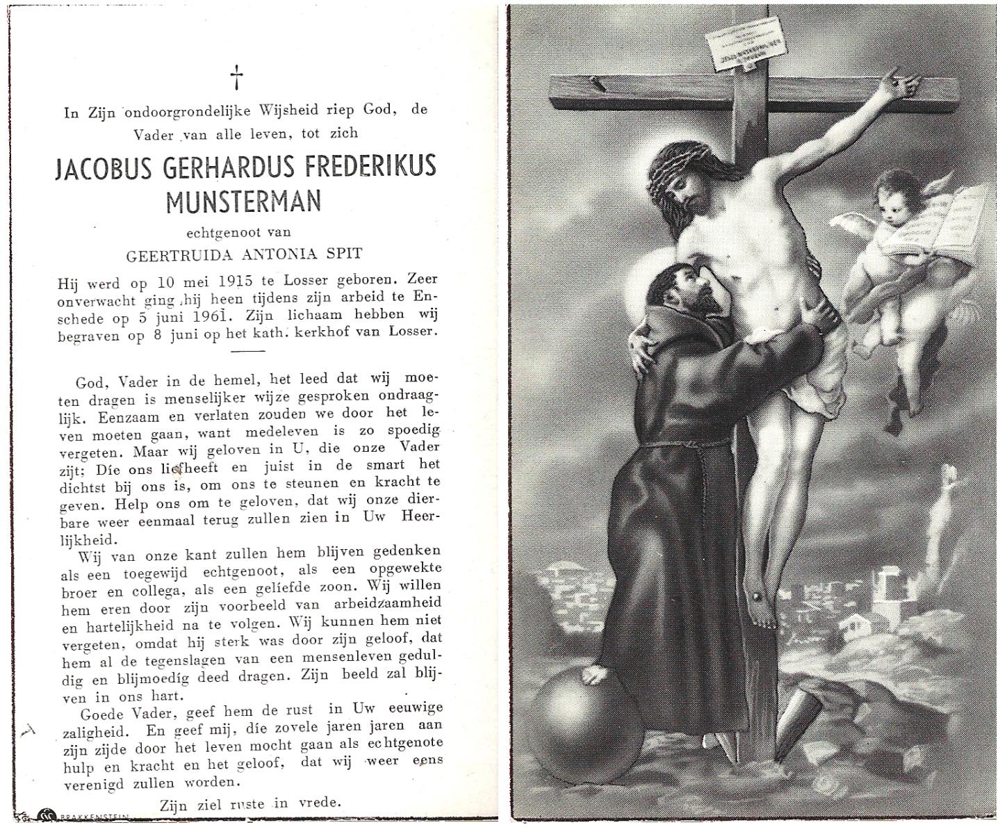 MUNSTERMAN, Jacobus Gerhardus Frederikus, geboren op 10-5-1915 te Losser, overleden op 5-6-1961 te Enschede op 46-jarige leeftijd, begraven op 8-6-1961 te Losser.
