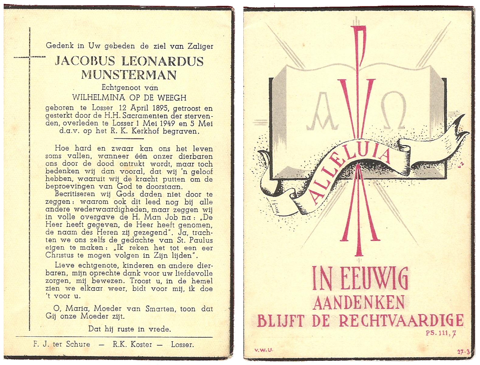 MUNSTERMAN, Jacobus Leonardus, geboren op 12-04-1895 te Losser, overleden op 1-5-1949 te Losser op 54-jarige leeftijd, begraven op 5-5-1949 te Losser.