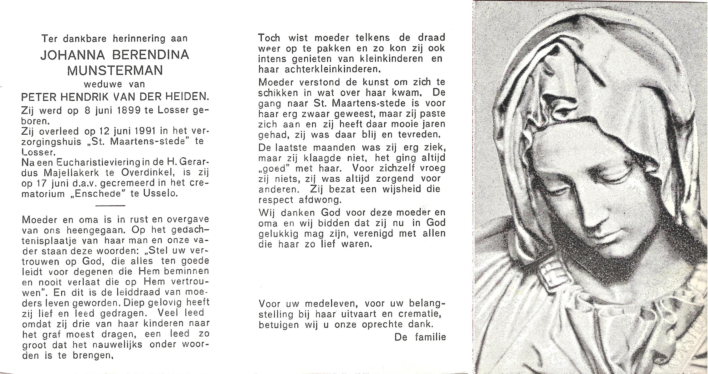 MUNSTERMAN, Johanna Berendina, geboren op 08-06-1899 te Losser, overleden op 12-6-1991 te Losser op 92-jarige leeftijd, gecremeerd op 17-6-1991 te Usselo.