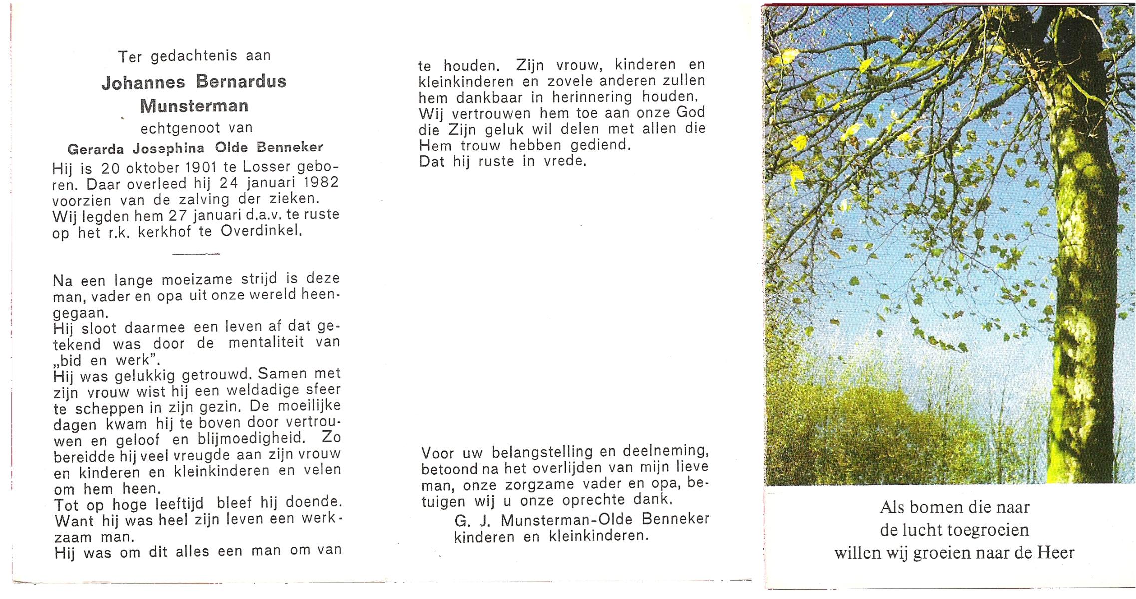 MUNSTERMAN, Johannes Bernardus, geboren op 20-10-1901 te Losser, overleden op 24-1-1982 te Losser op 80-jarige leeftijd, begraven op 27-1-1982 te Overdinkel.