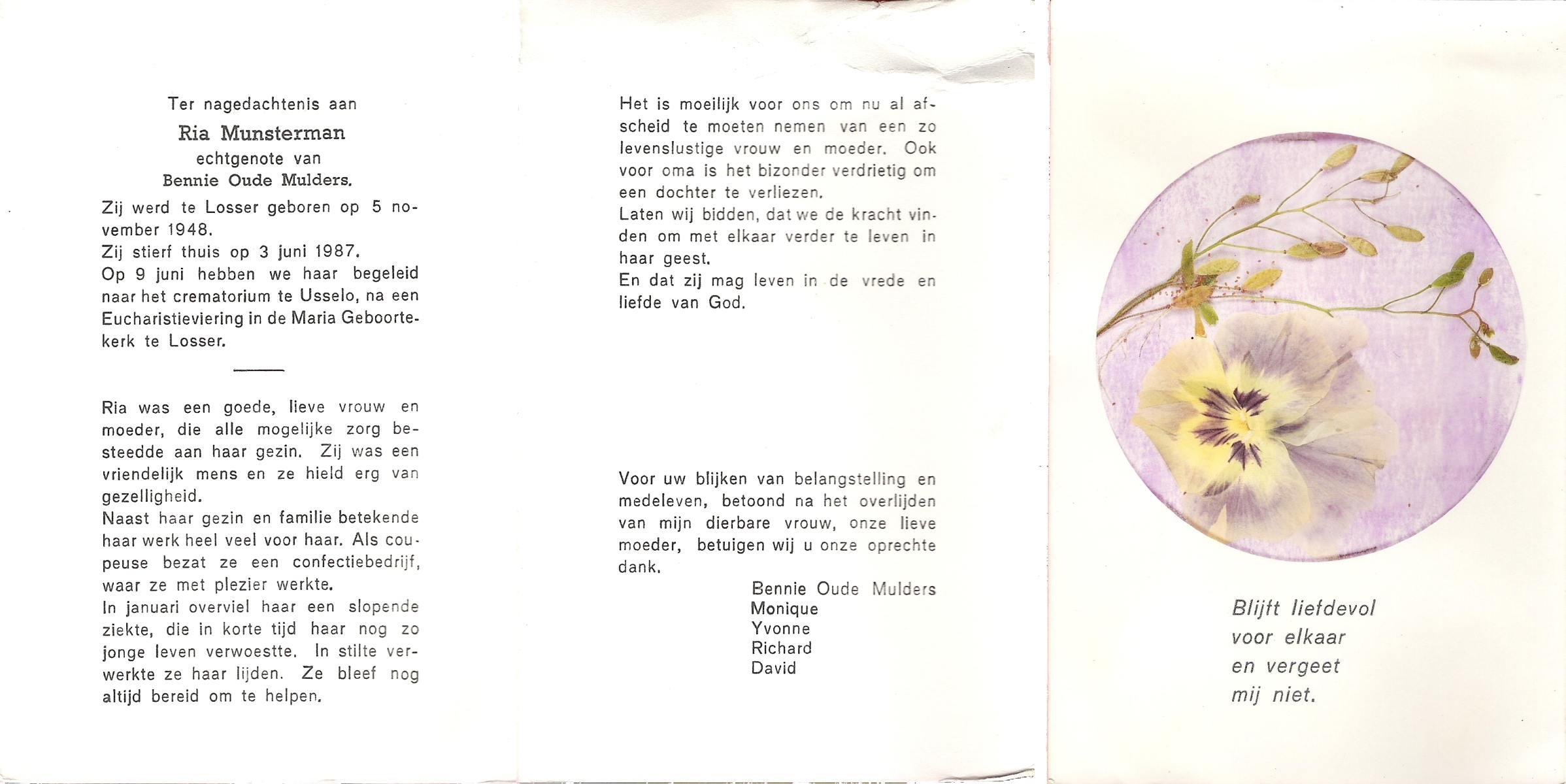 MUNSTERMAN, Ria, geboren op 5-11-1948 te Losser, overleden op 3-6-1987 te Losser op 38-jarige leeftijd, gecremeerd op 9-6-1987 te Usselo.