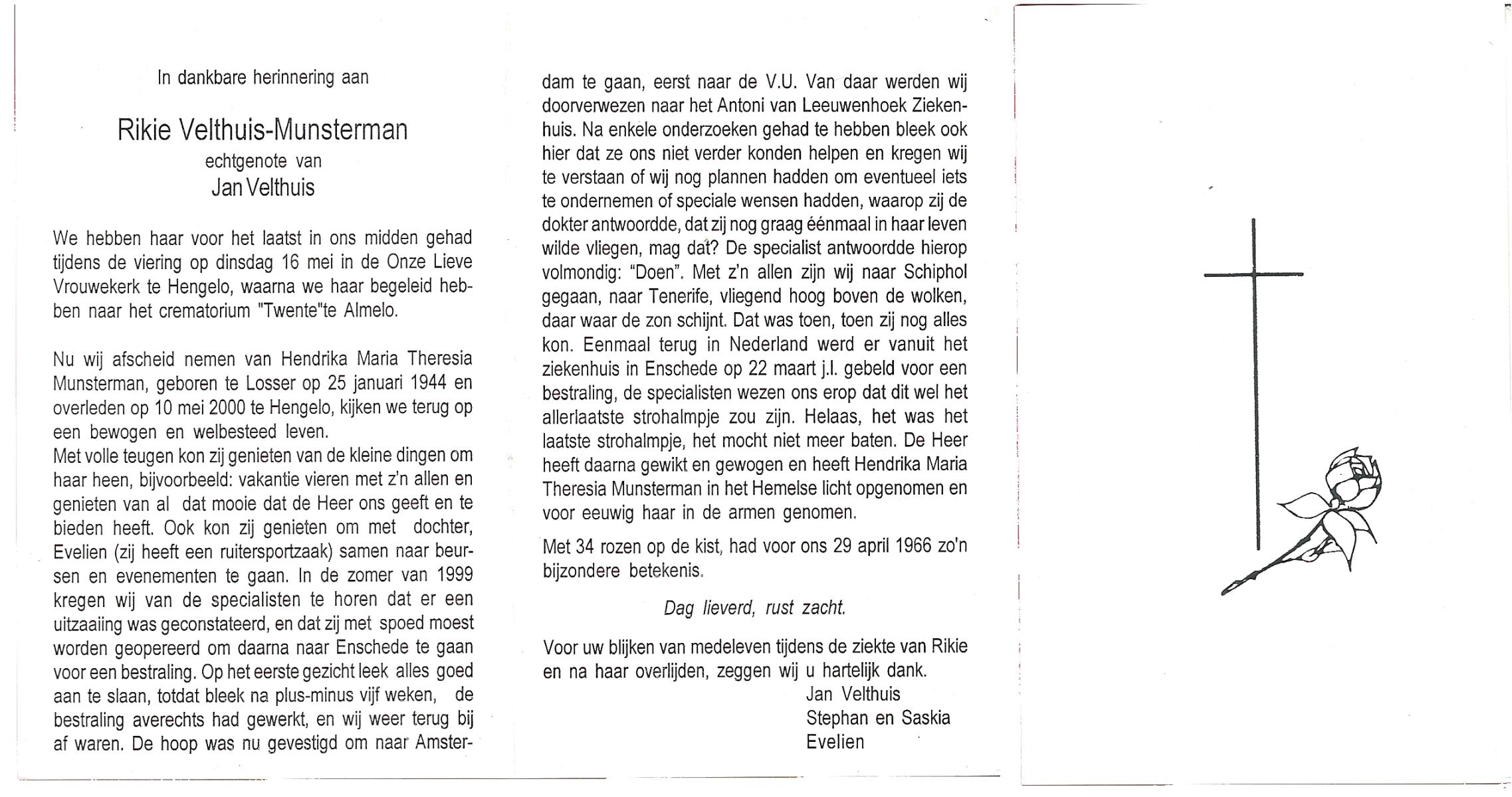 MUNSTERMAN, Rikie, geboren op 25-1-1944 te Losser, overleden op 10-5-2000 te Hengelo (Ov.) op 56-jarige leeftijd, gecremeerd op 16-5-2000 te Almelo.