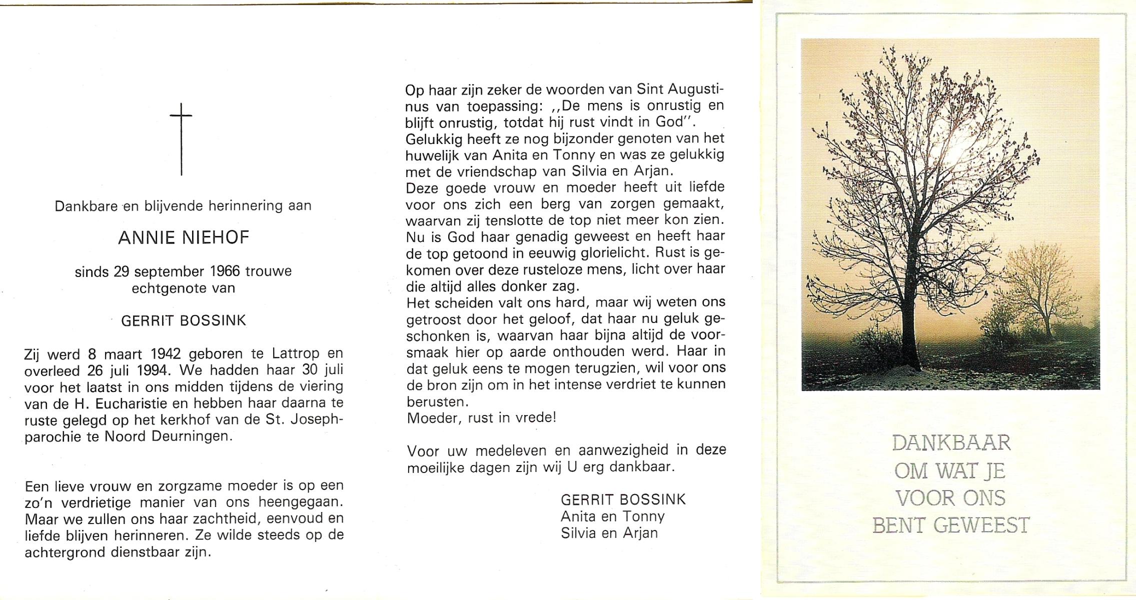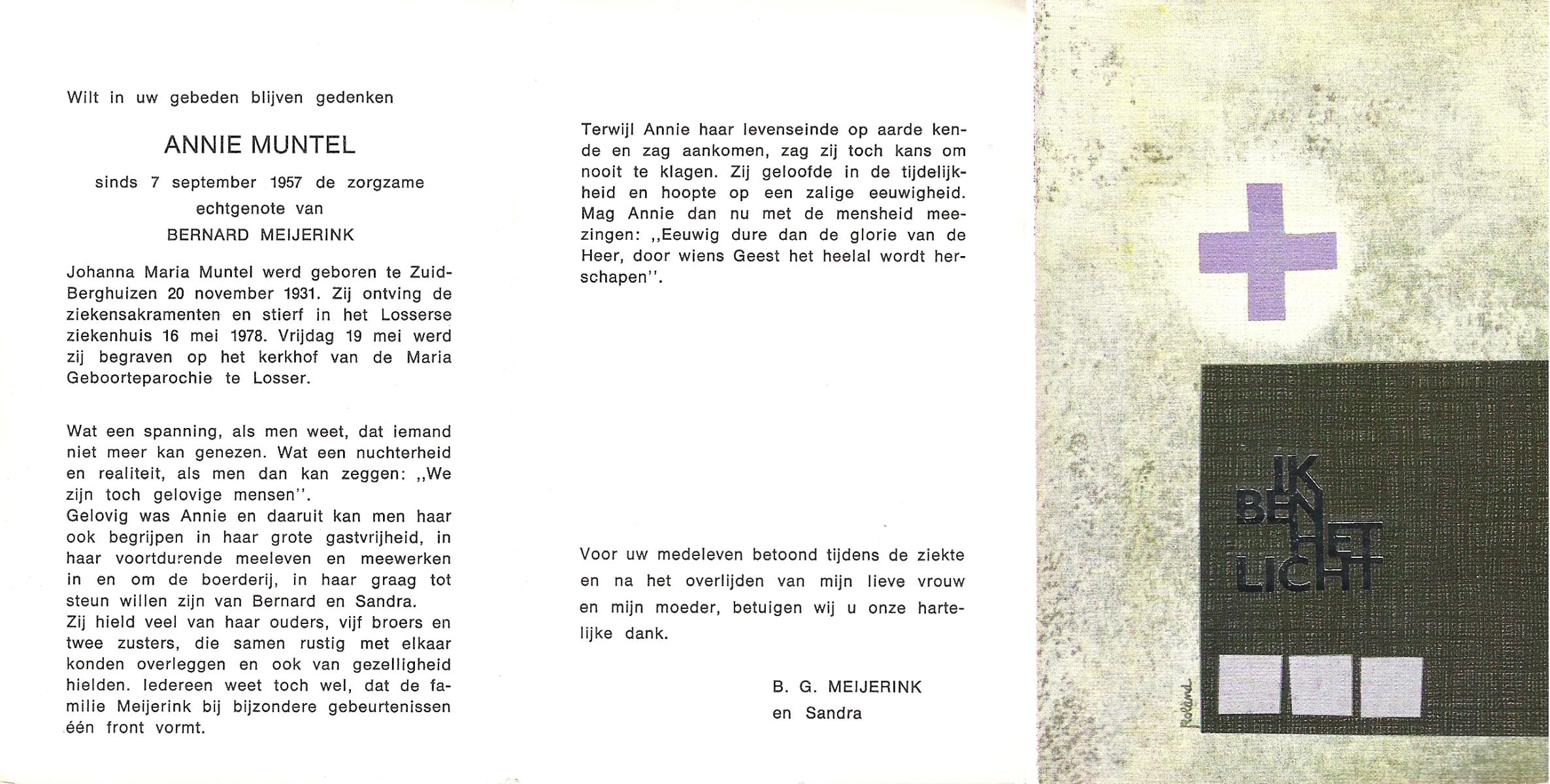 MUNTEL, Annie, geboren op 20-11-1931 te Zuid Berghuizen, overleden op 16-5-1978 te Losser op 46-jarige leeftijd, begraven op 19-5-1978 te Losser.