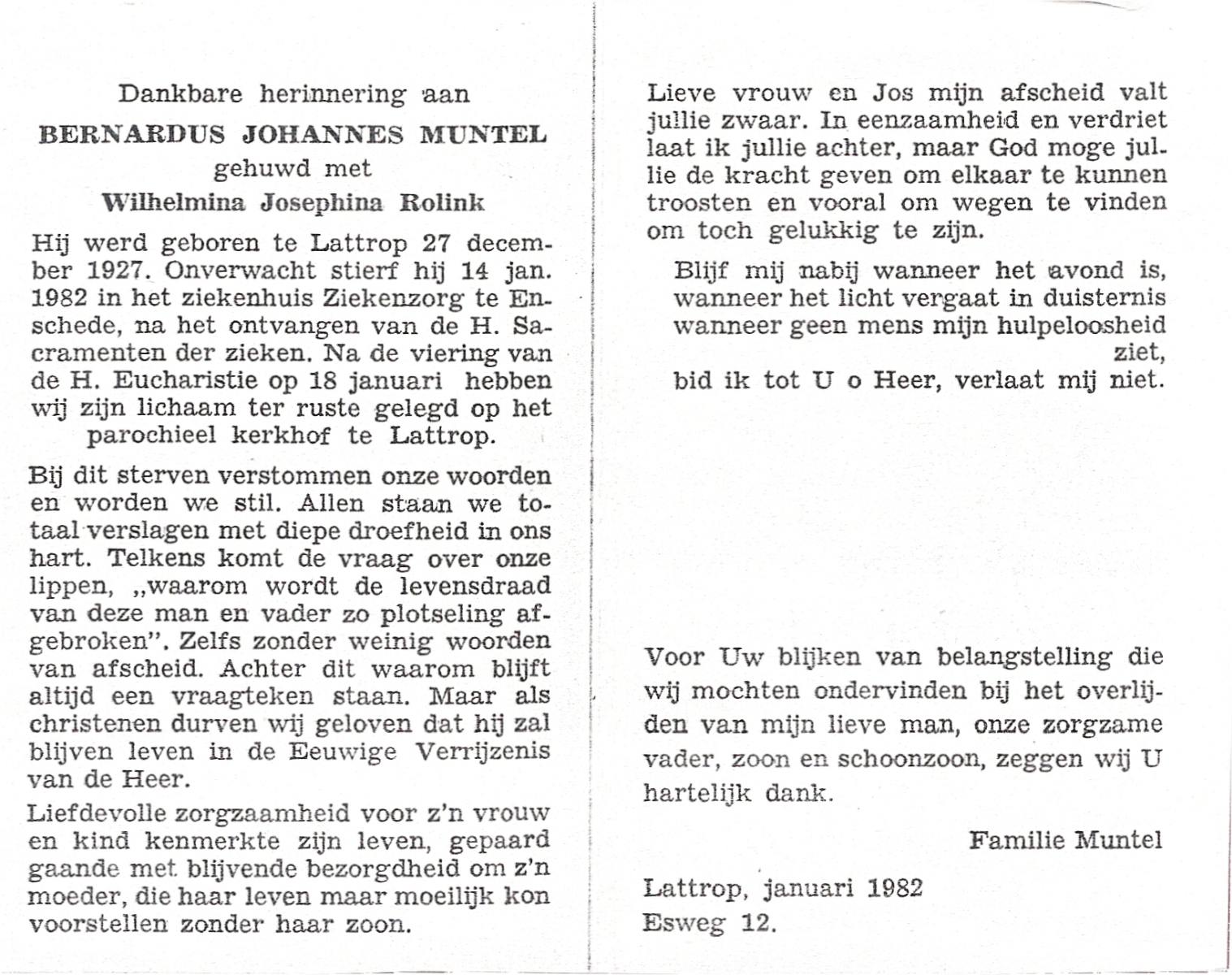 MUNTEL, Bernardus Johannes, geboren op 27-12-1927 te Lattrop, overleden op 14-1-1982 te Enschede op 54-jarige leeftijd, begraven op 18-1-1982 te Lattrop.