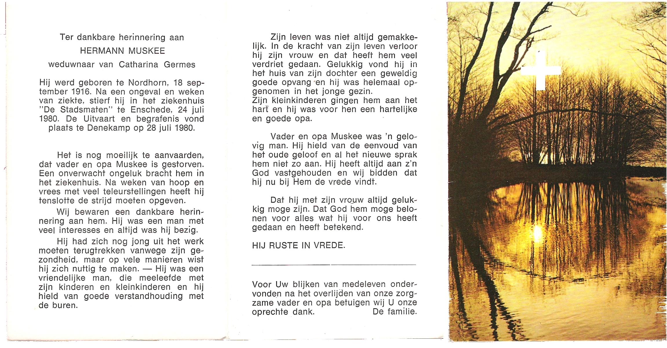 MUSKEE, Hermann, geboren op 18-9-1916 te Nordhorn (Dld.), overleden op 24-7-1980 te Enschede op 63-jarige leeftijd, begraven op 28-7-1980 te Denekamp.