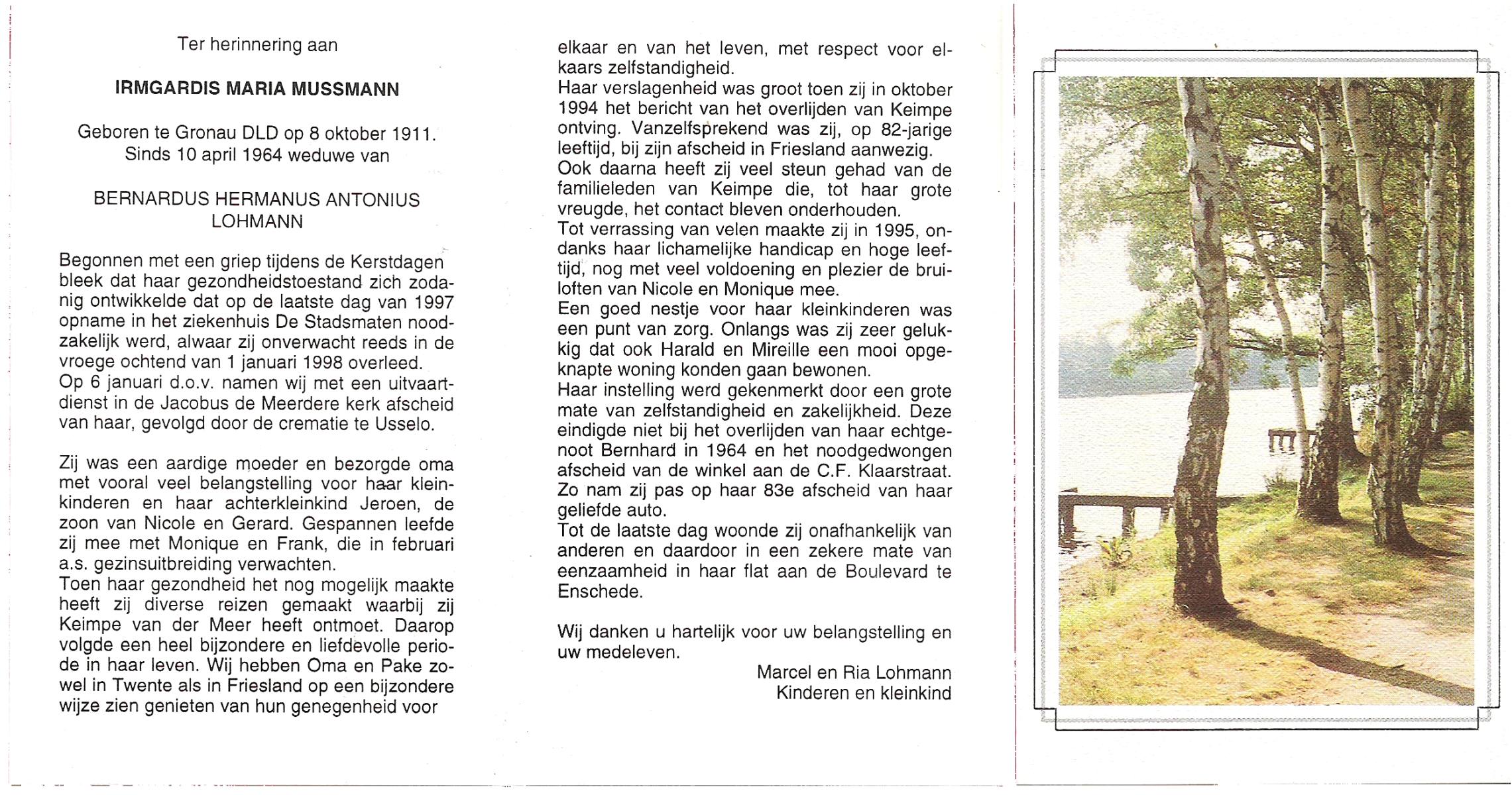 MUSSMANN, Irmgardis Maria, geboren op 8-10-1911 te Gronau (Dld.), overleden op 1-1-1998 te Enschede op 86-jarige leeftijd, gecremeerd op 6-1-1998 te Usselo.