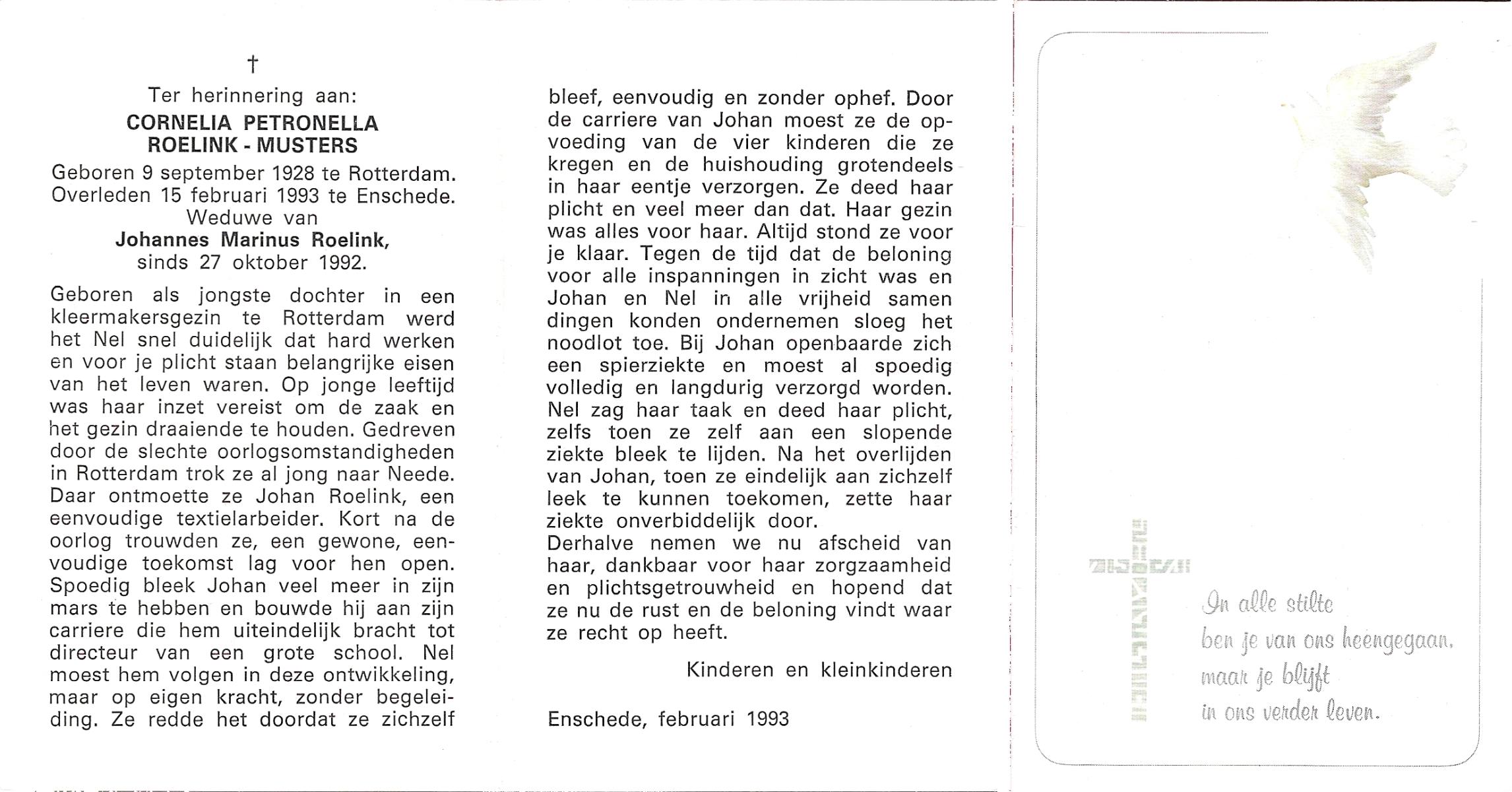 MUSTERS, Cornelia Petronella, geboren op 9-9-1928 te Rotterdam, overleden op 15-2-1993 te Enschede op 64-jarige leeftijd.