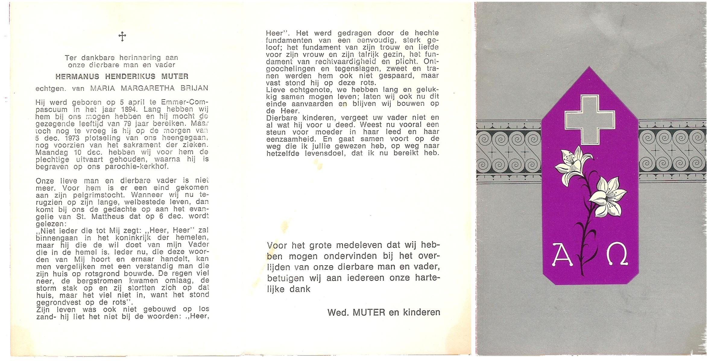MUTER, Herman Henderikus, geboren op 05-04-1894 te Emmer-Compascuum, overleden op 5-12-1973 op 79-jarige leeftijd.