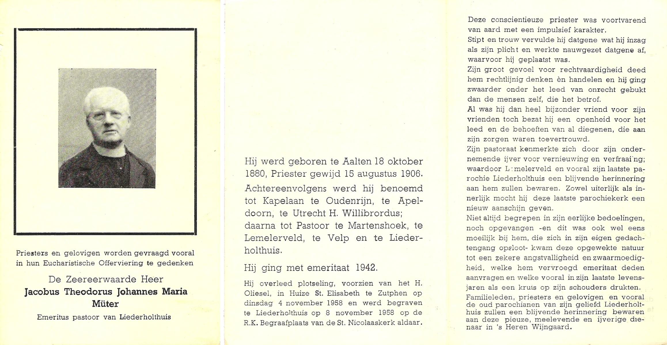 MÜTER, Jacobus Theodorus Johannes Maria, geboren op 18-10-1880 te Aaalten, overleden op 4-11-1958 te Zutphen op 78-jarige leeftijd, begraven te Heino, Liederholthuis.