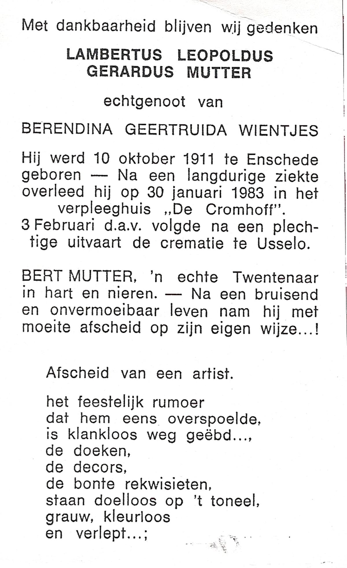 MUTTER, Lambertus Leopoldus Gerardus, geboren op 10-10-1911 te Enschede, overleden op 30-1-1983 te Enschede op 71-jarige leeftijd, gecremeerd op 3-2-1983 te Usselo.
