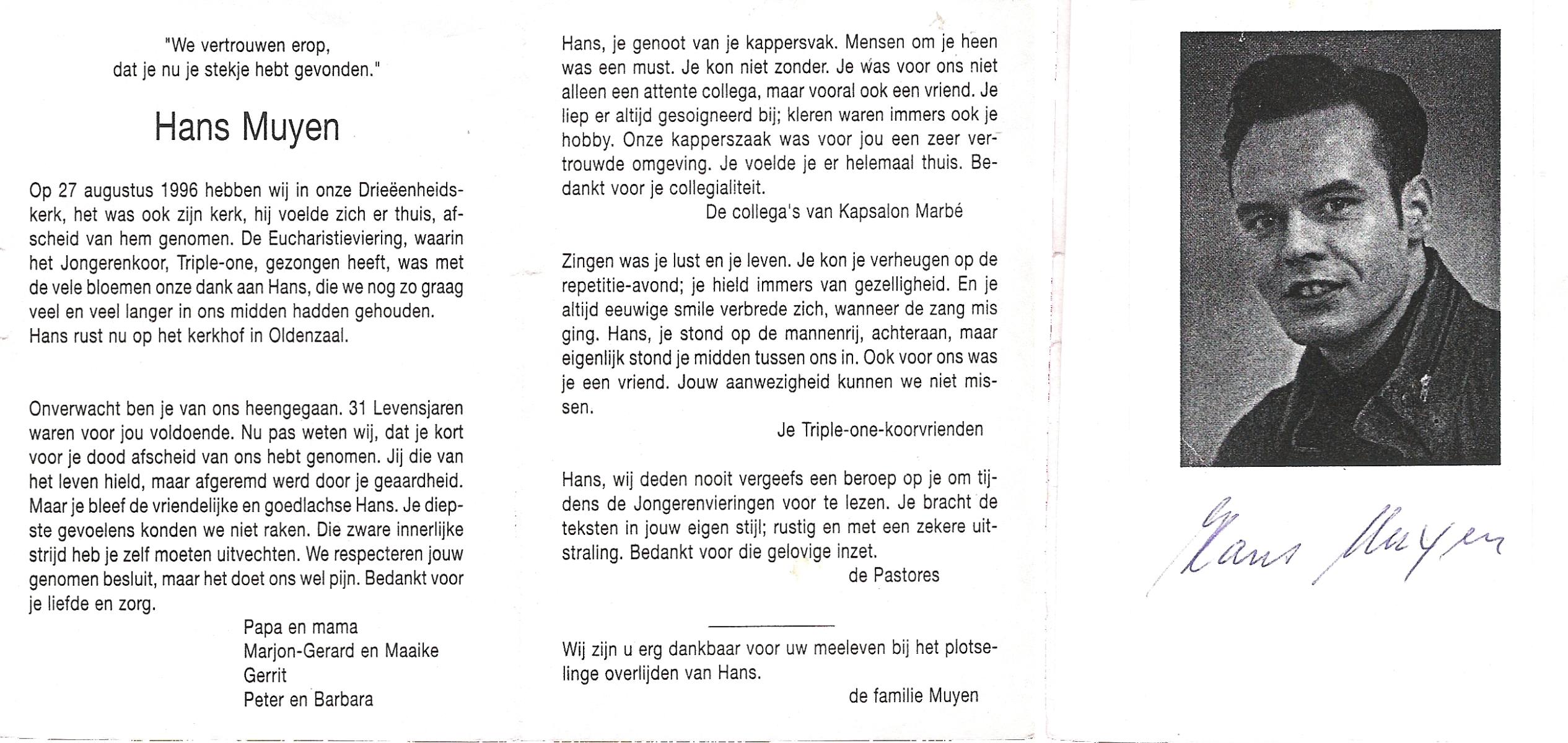 MUYEN, Hans op 31-jarige leeftijd, begraven op 27-8-1996 te Oldenzaal.