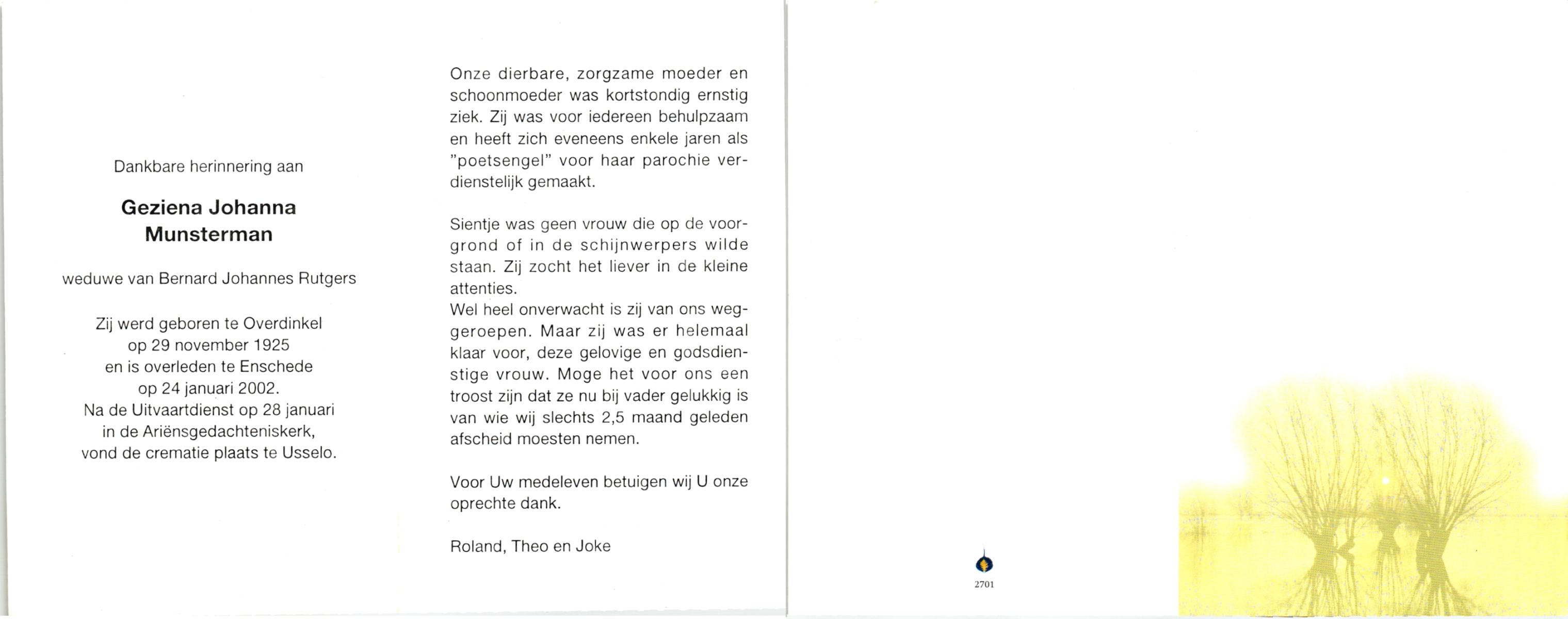 MUNSTERMAN, , Geziena Johanna, geboren op 29-11-1925 te Overdinkel, overleden op 24-1-2002 te Enschede op 76-jarige leeftijd, gecremeerd op 28-1-2002 te Usselo.