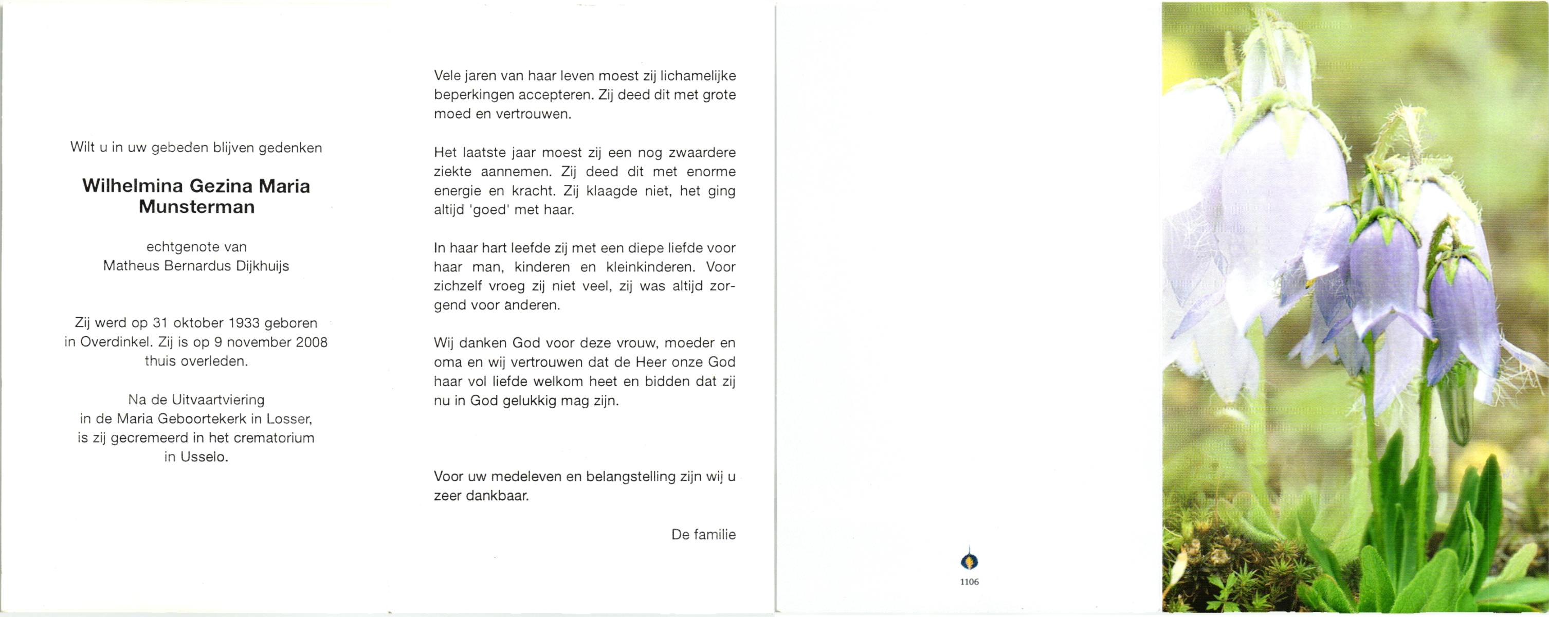 MUNSTERMAN, , Wilhelmina Gezina Maria, geboren op 31-10-1933 te Overdinkel, overleden op 9-11-2008 te Overdinkel op 75-jarige leeftijd, gecremeerd te Usselo.
