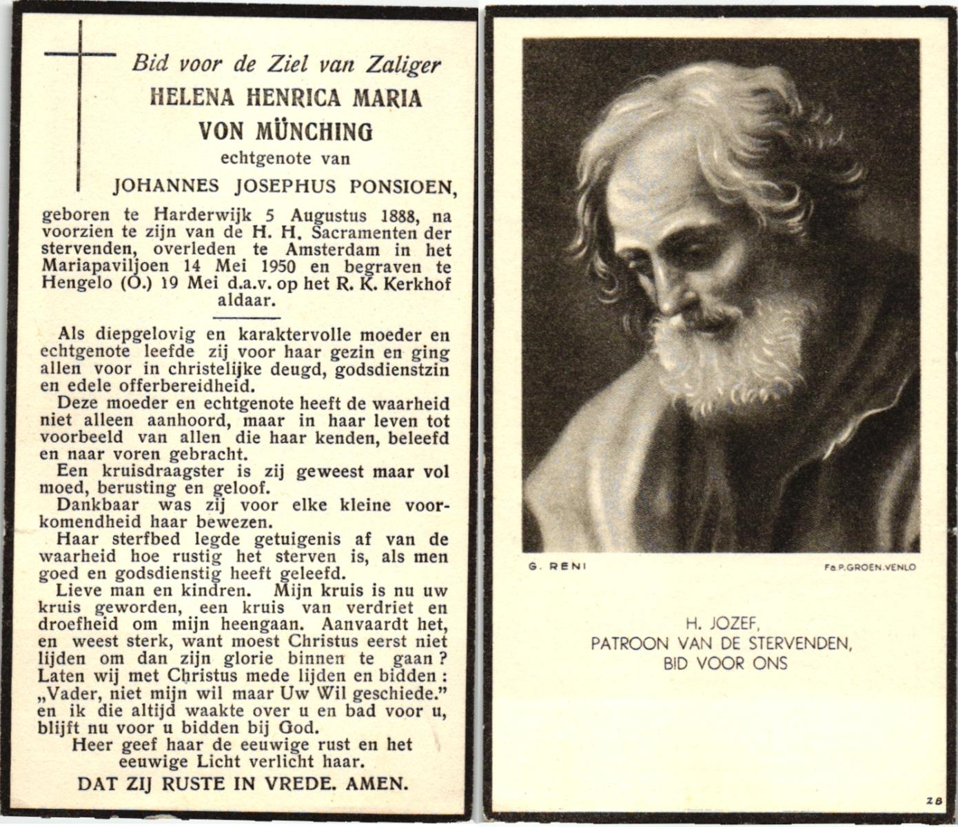 MUNCHING, von, Helena Henrica Maria, geboren op 05-08-1888 te Harderwijk, overleden op 14-5-1950 te Amsterdam op 62-jarige leeftijd, begraven op 19-5-1950 te Hengelo.
