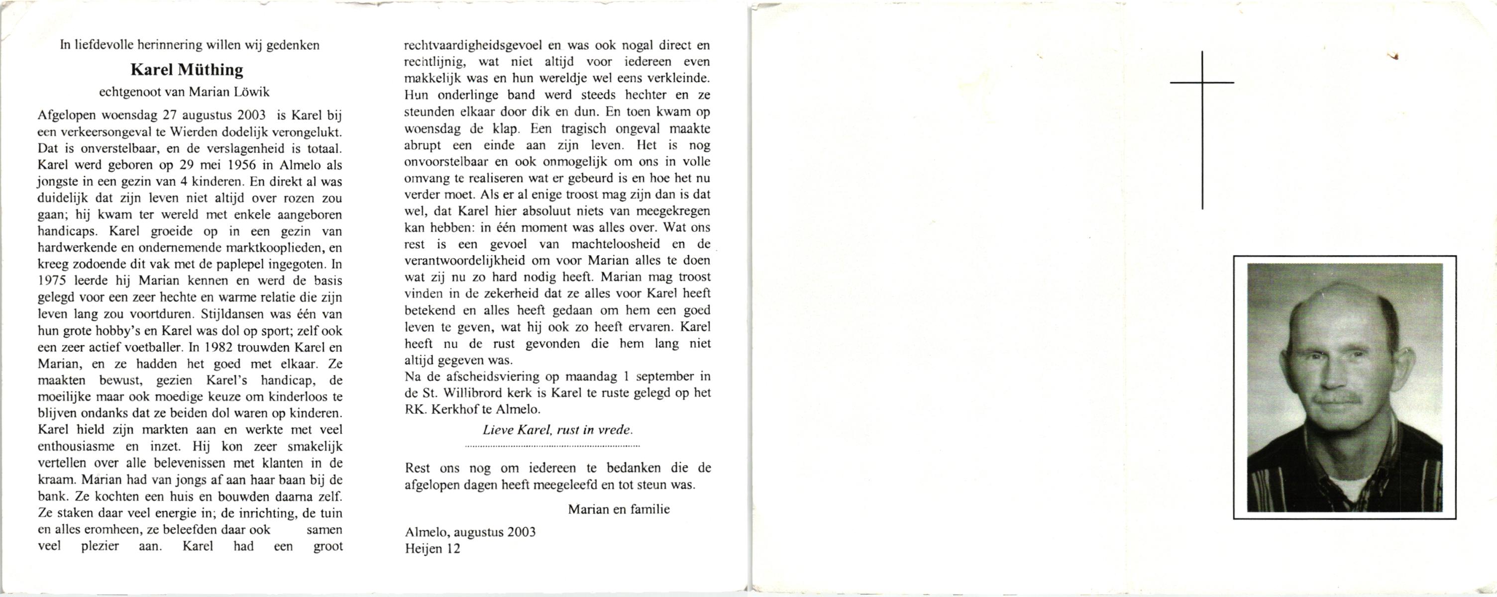 MÜTHING, , Karel, geboren op 29-5-1956 te Almelo, overleden op 27-8-2003 te Wierden op 47-jarige leeftijd.