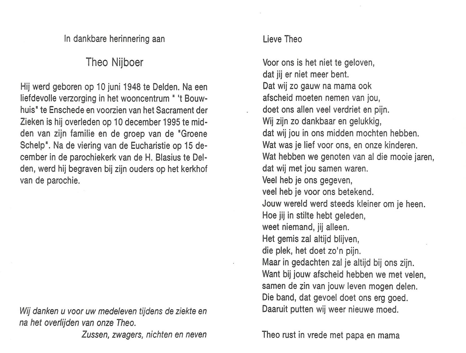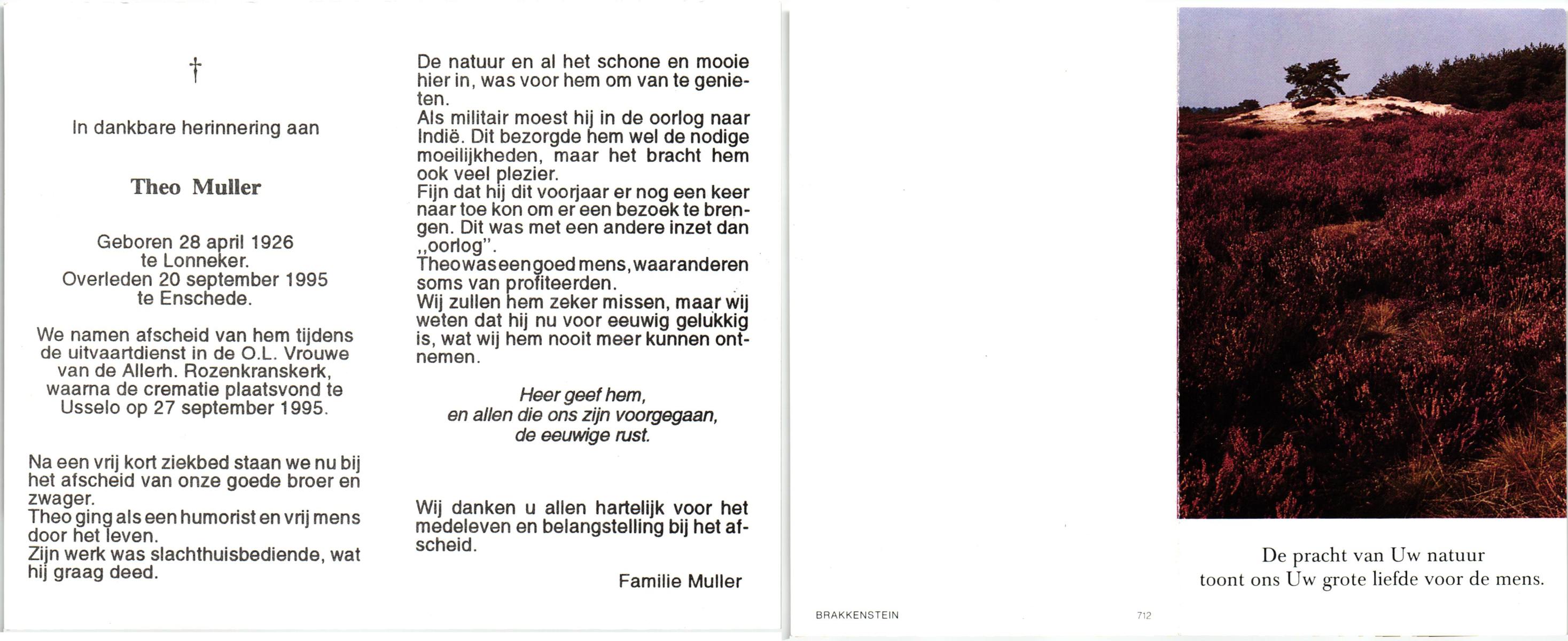 MULLER, Theo, geboren op 28-4-1926 te Lonneker, overleden op 20-9-1995 te Enschede op 69-jarige leeftijd, gecremeerd op 27-9-1995 te Usselo.
