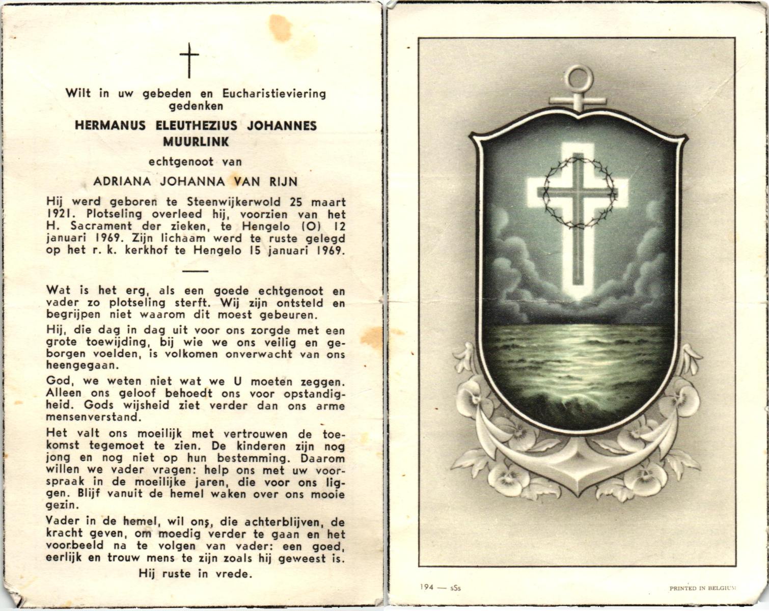 MUURLINK, Hermanus Eleuthezius Johannes, geboren op 25-3-1921 te Steenwijkerwold, overleden op 12-1-1969 te Hengelo op 47-jarige leeftijd, begraven op 15-1-1969 te Hengelo.