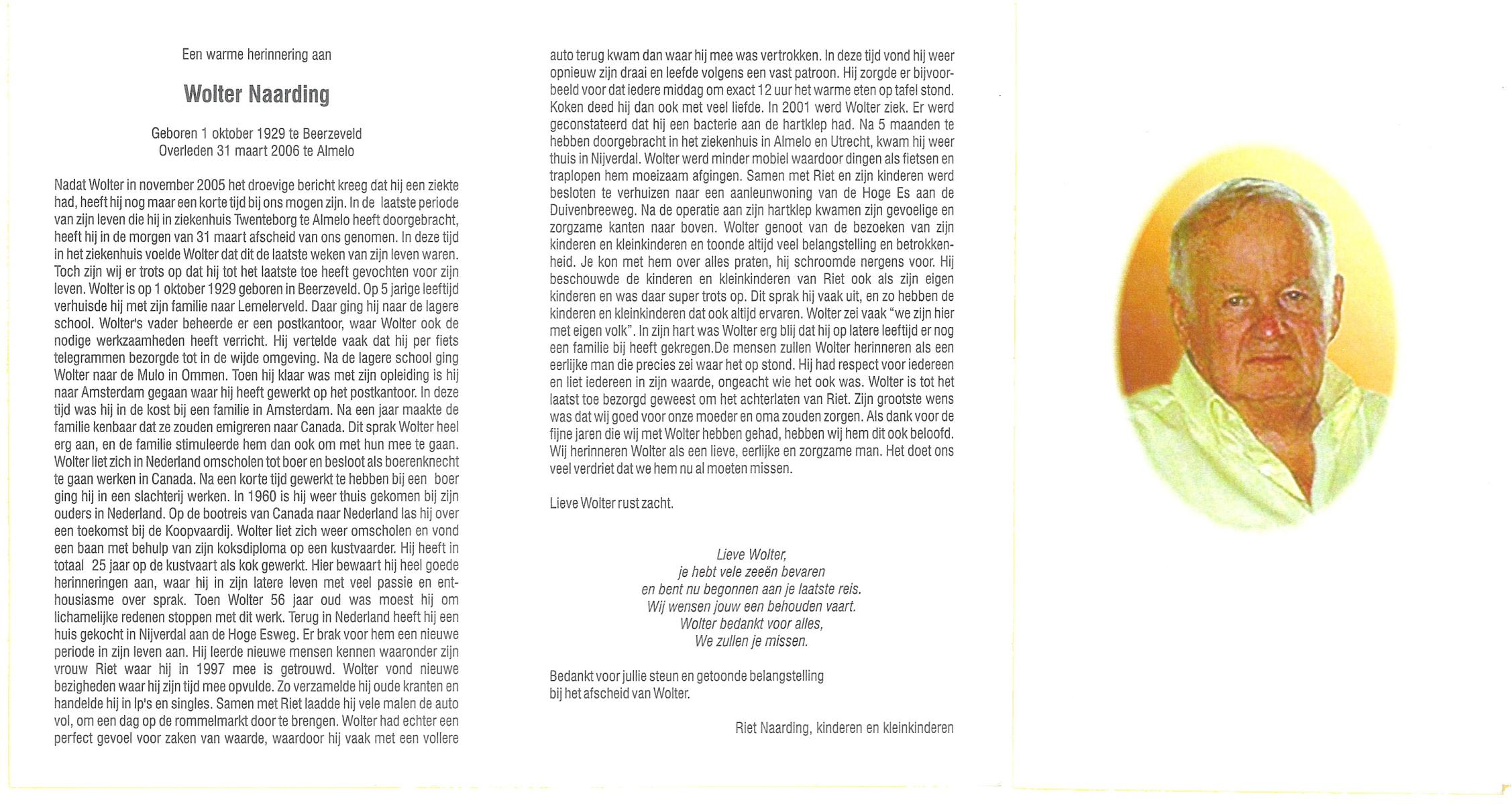 NAARDING, Wolter, geboren op 1-10-1929 te Beerzerveld, overleden op 31-3-2006 te Almelo op 76-jarige leeftijd.