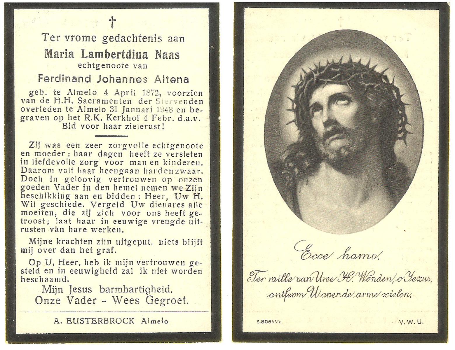 NAAS, Maria Lambertdina, geboren op 04-04-1872 te Almelo, overleden op 31-1-1943 te Almelo op 70-jarige leeftijd, begraven op 4-2-1943 te Almelo.