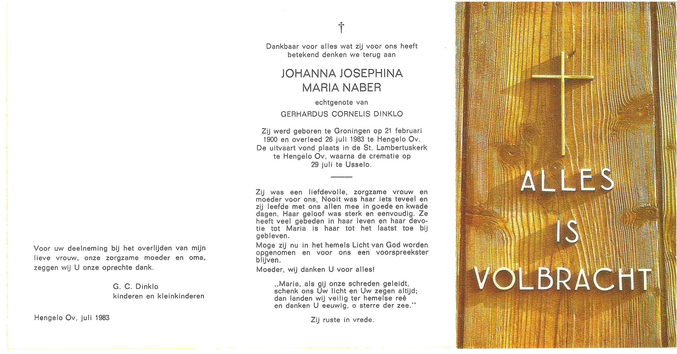 NABER, Johanna Josephina Maria, geboren op 21-2-1900 te Groningen, overleden op 26-7-1983 te Hengelo (Ov.) op 83-jarige leeftijd, gecremeerd op 29-7-1983 te Usselo.