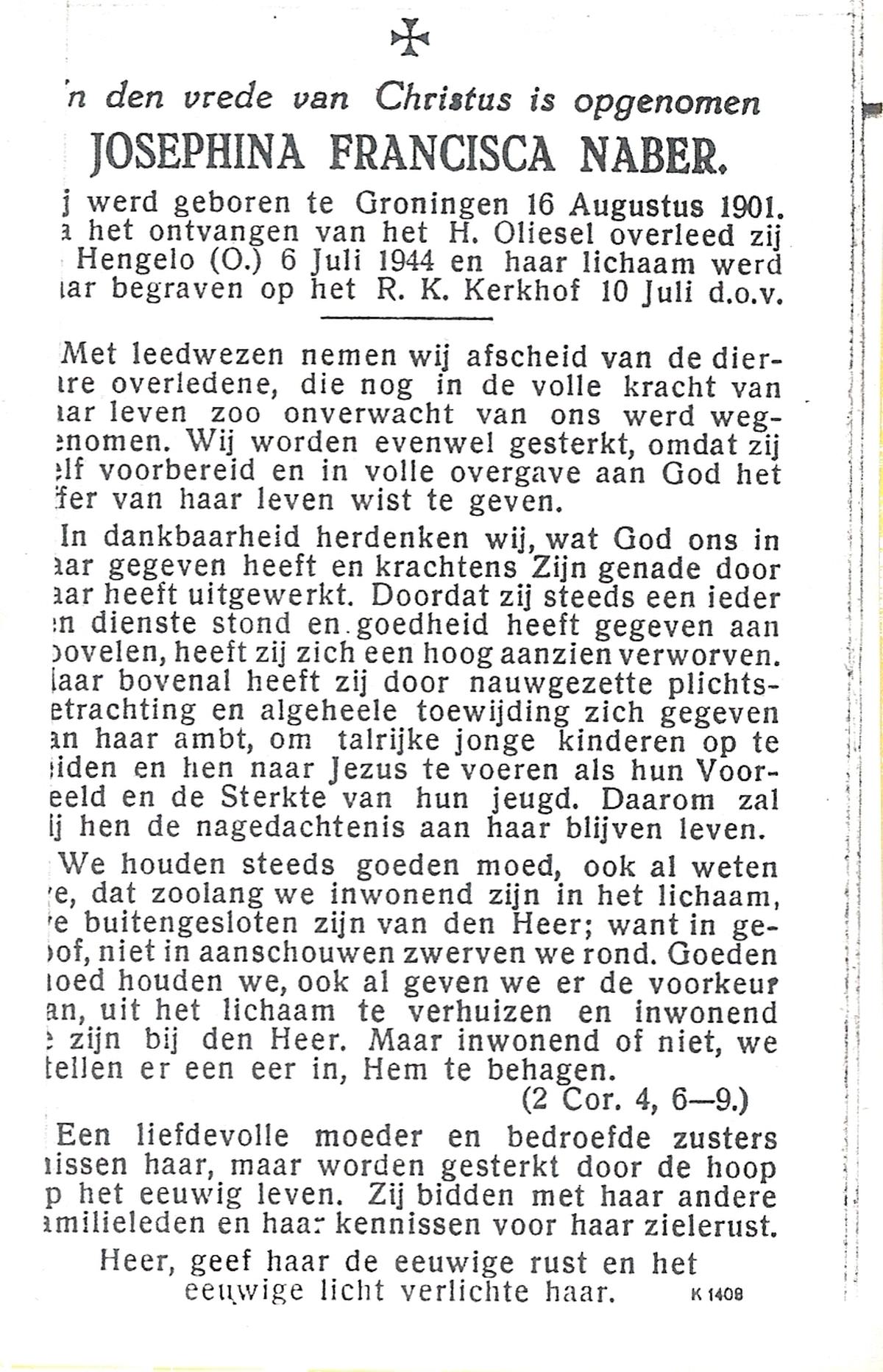 NABER, Josephina Francisca, geboren op 16-8-1901 te Groningen, overleden op 6-7-1944 te Hengelo (Ov.) op 42-jarige leeftijd, begraven op 10-7-1944 te Hengelo (Ov.).