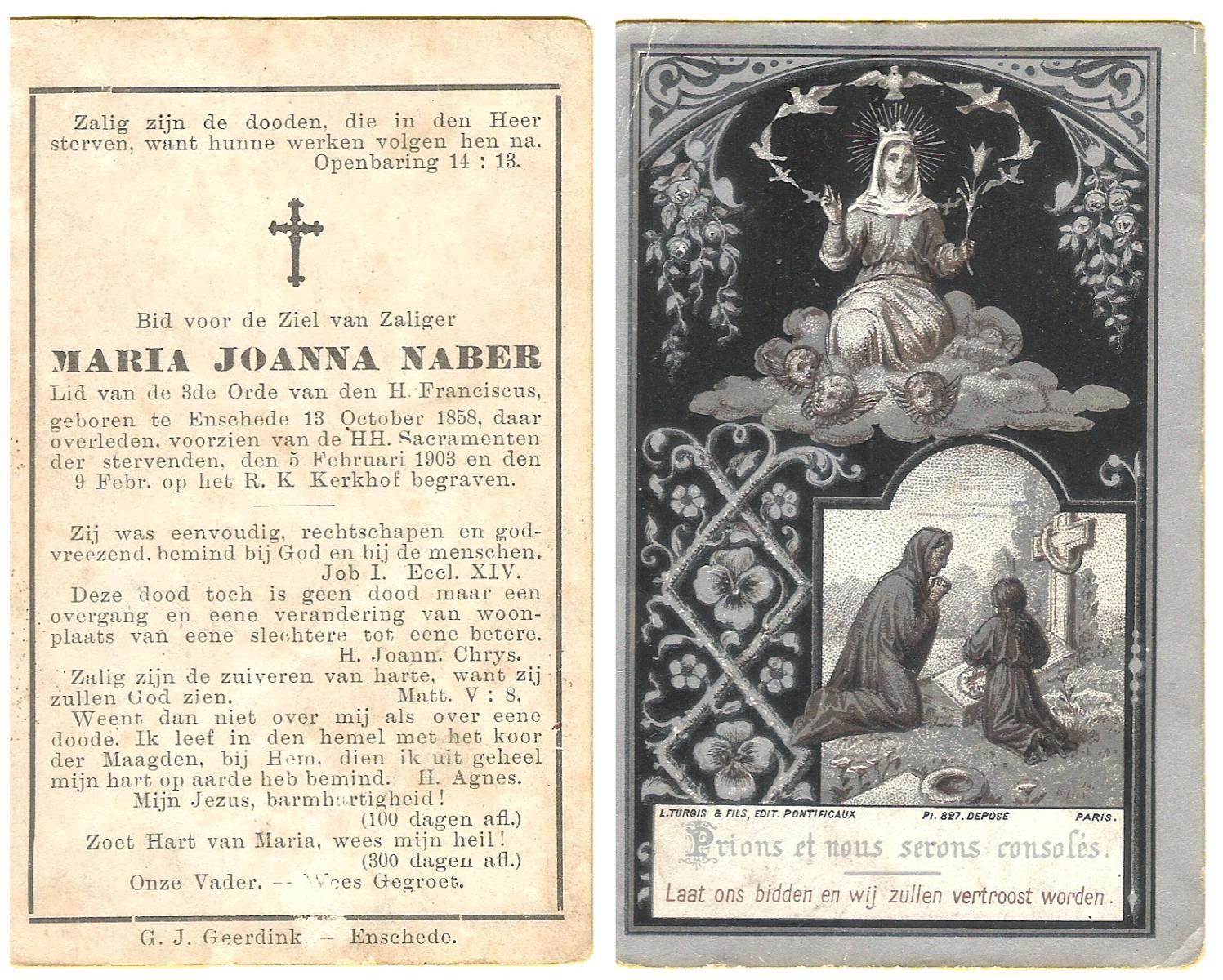 NABER, Maria Joanna, geboren op 13-10-1858 te Enschede, overleden op 5-2-1903 te Enschede op 44-jarige leeftijd, begraven op 9-2-1903 te Enschede.