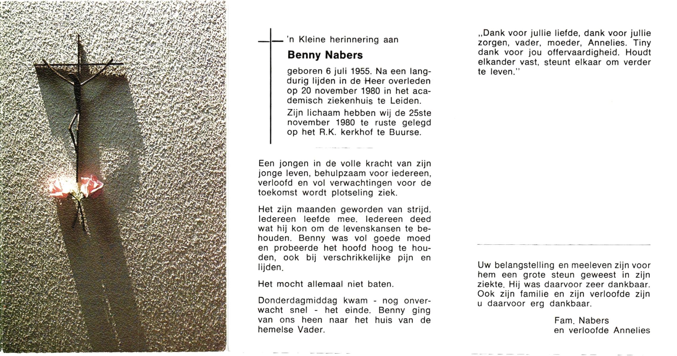 NABERS, Benny, geboren op 6-7-1955, overleden op 20-11-1980 te Leiden op 25-jarige leeftijd, begraven op 25-11-1980 te Buurse.