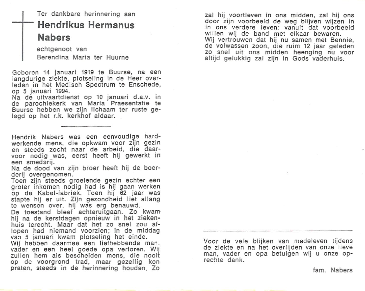 NABERS, Hendrikus Hermanus, geboren op 14-1-1919 te Buurse, overleden op 5-1-1994 te Enschede op 74-jarige leeftijd, begraven op 10-1-1994 te Buurse.