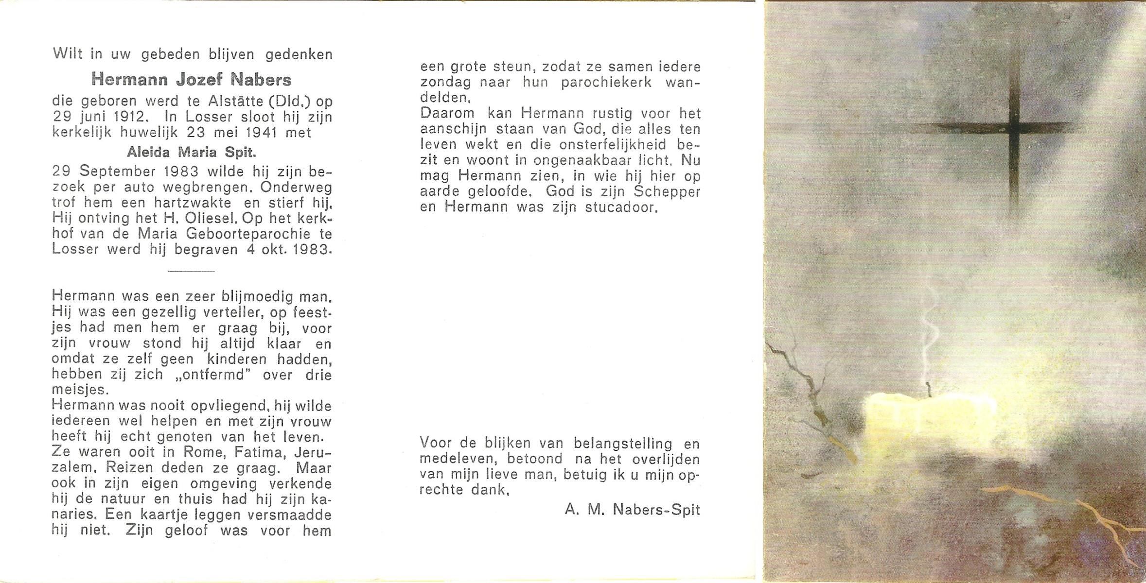 NABERS, Hermann Jozef, geboren op 29-6-1912 te Alst.tte (Dld.), overleden op 29-9-1983 op 71-jarige leeftijd, begraven op 4-10-1983 te Losser.