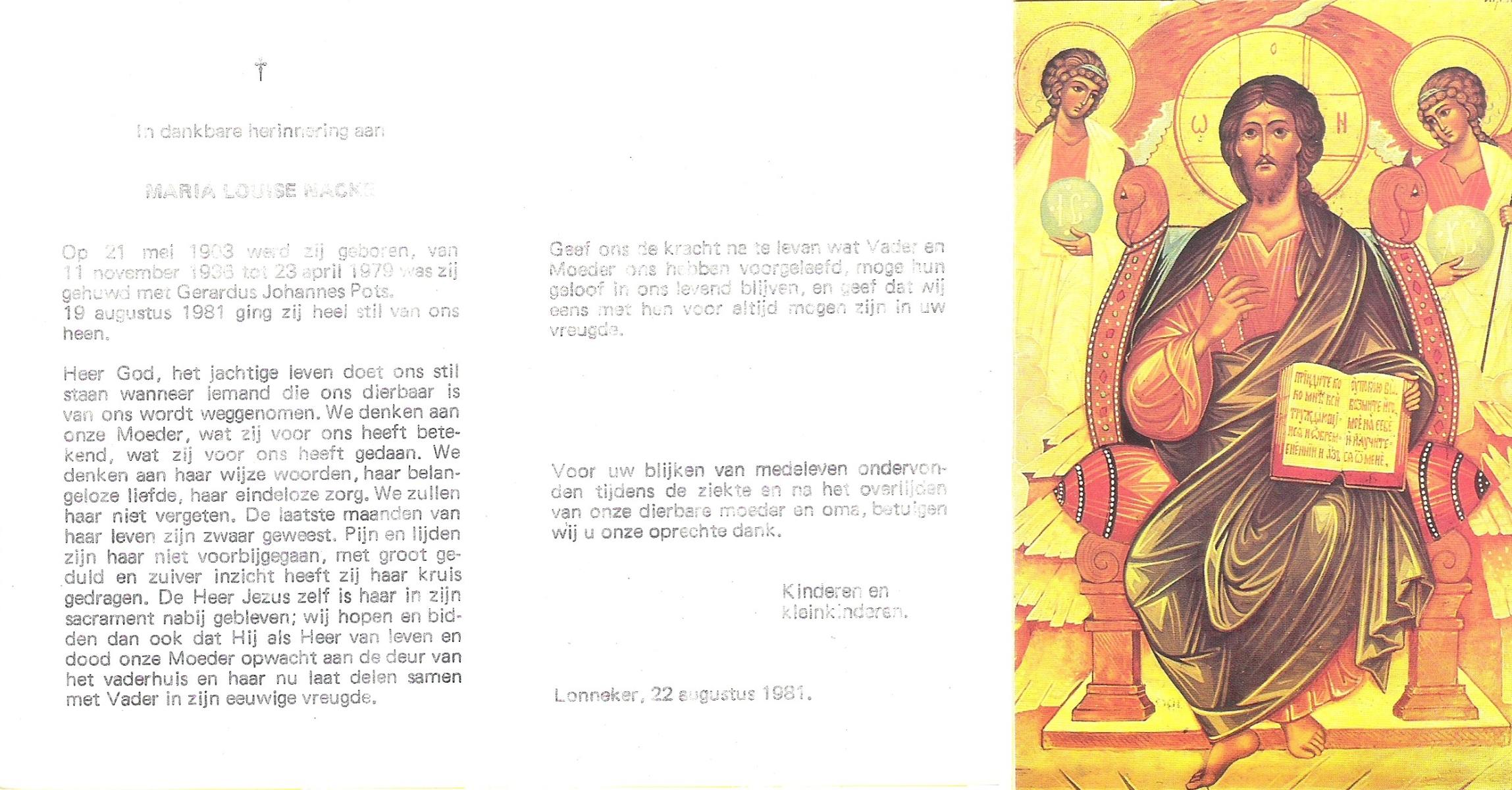 NACKE, Maria Louise, geboren op 21-5-1903, overleden op 19-8-1981 op 78-jarige leeftijd.