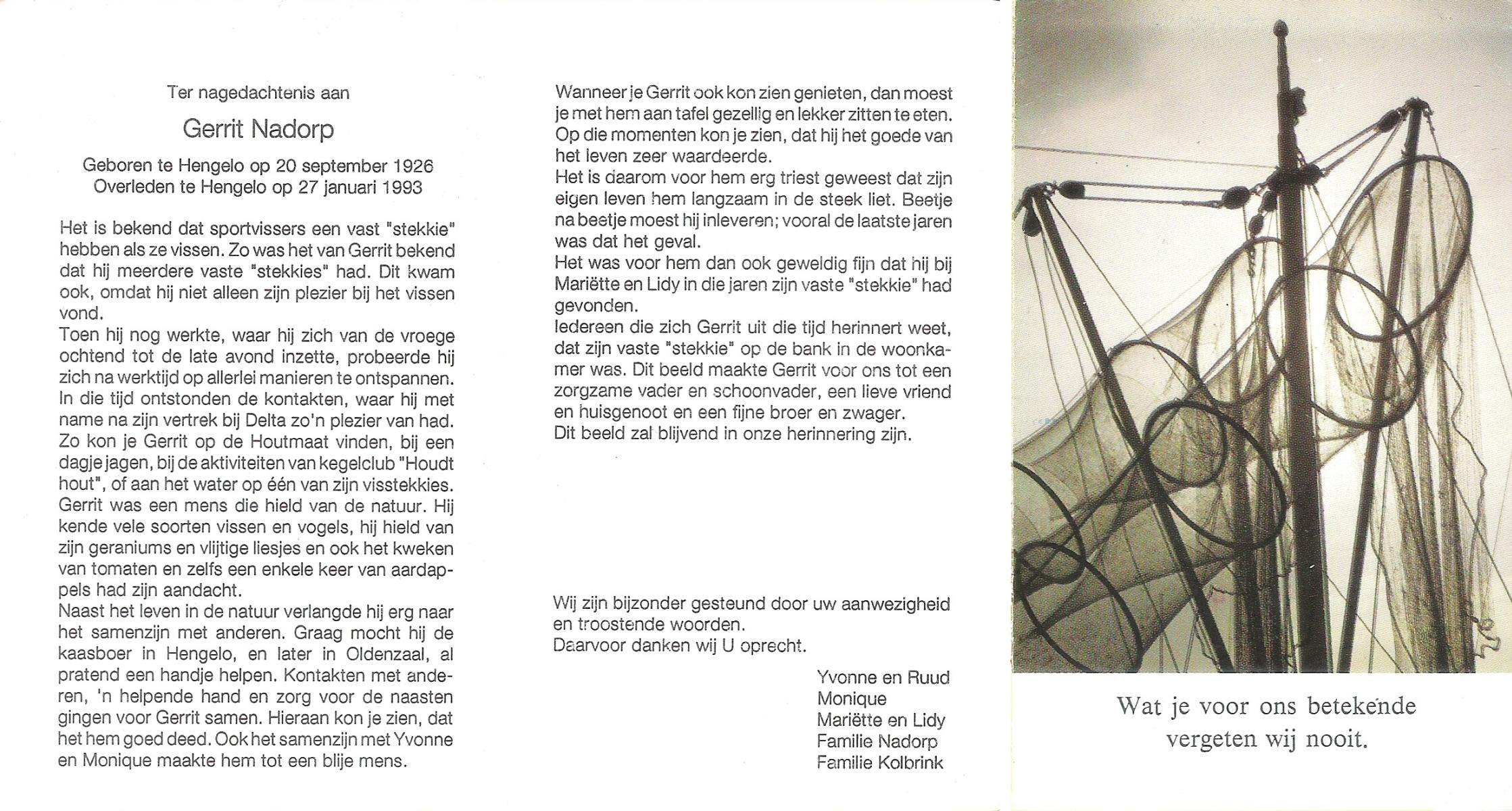 NADORP, Gerrit, geboren op 20-9-1926 te Hengelo (O), overleden op 27-1-1993 te Hengelo (Ov.) op 66-jarige leeftijd.