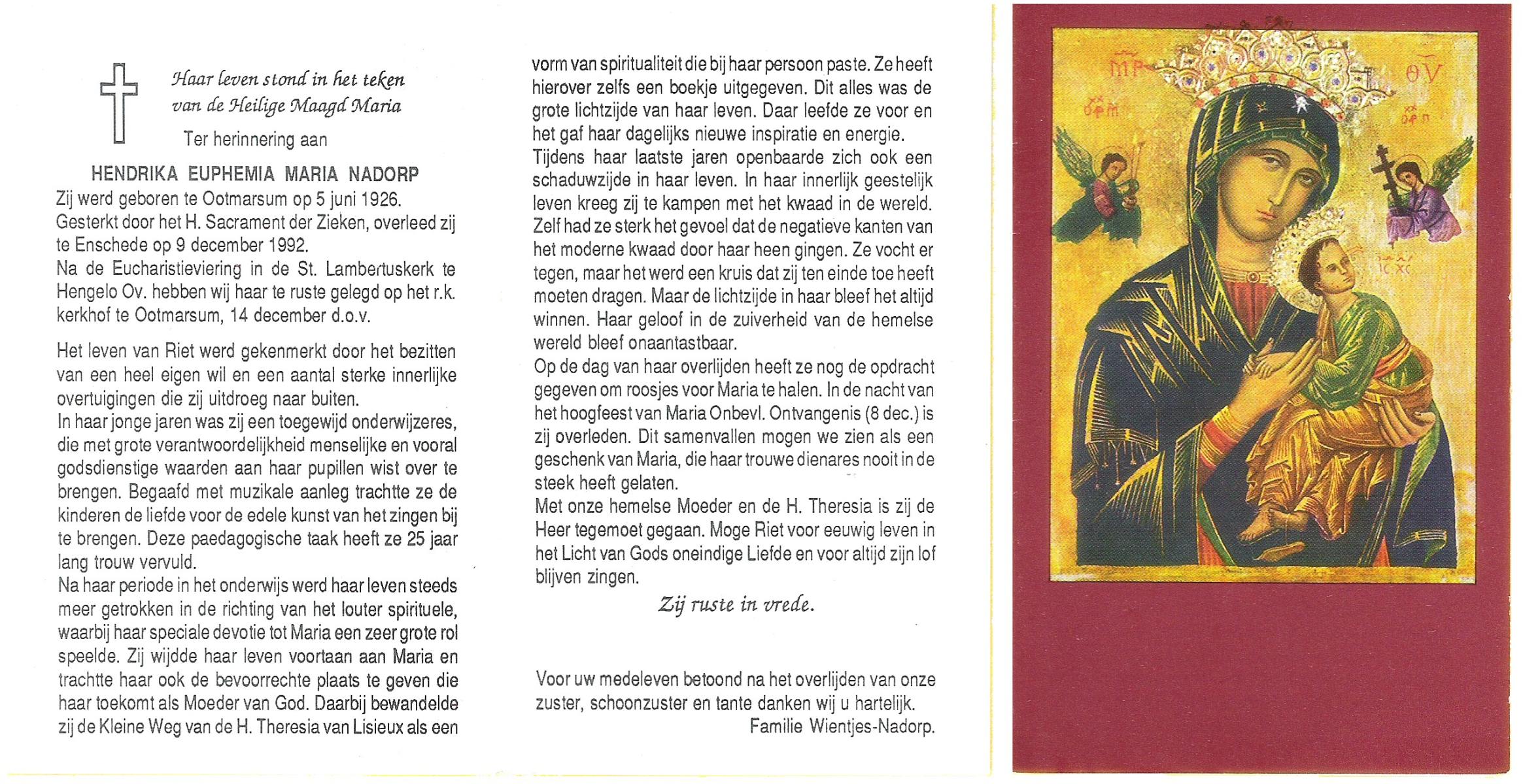 NADORP, Hendrika Euphemia Maria, geboren op 5-6-1926 te Ootmarsum, overleden op 9-12-1992 te Enschede op 66-jarige leeftijd, begraven op 14-12-1992 te Ootmarsum.